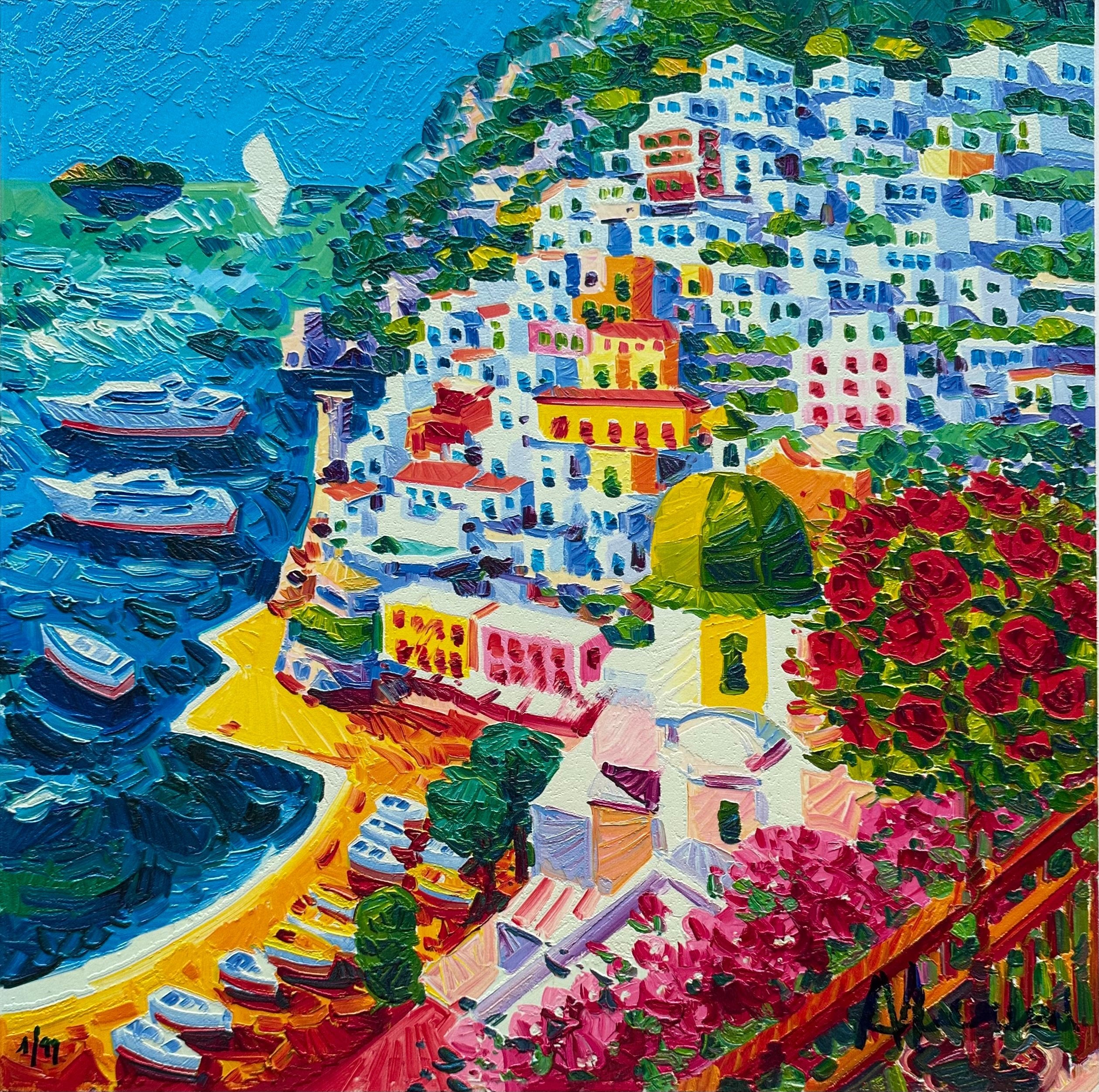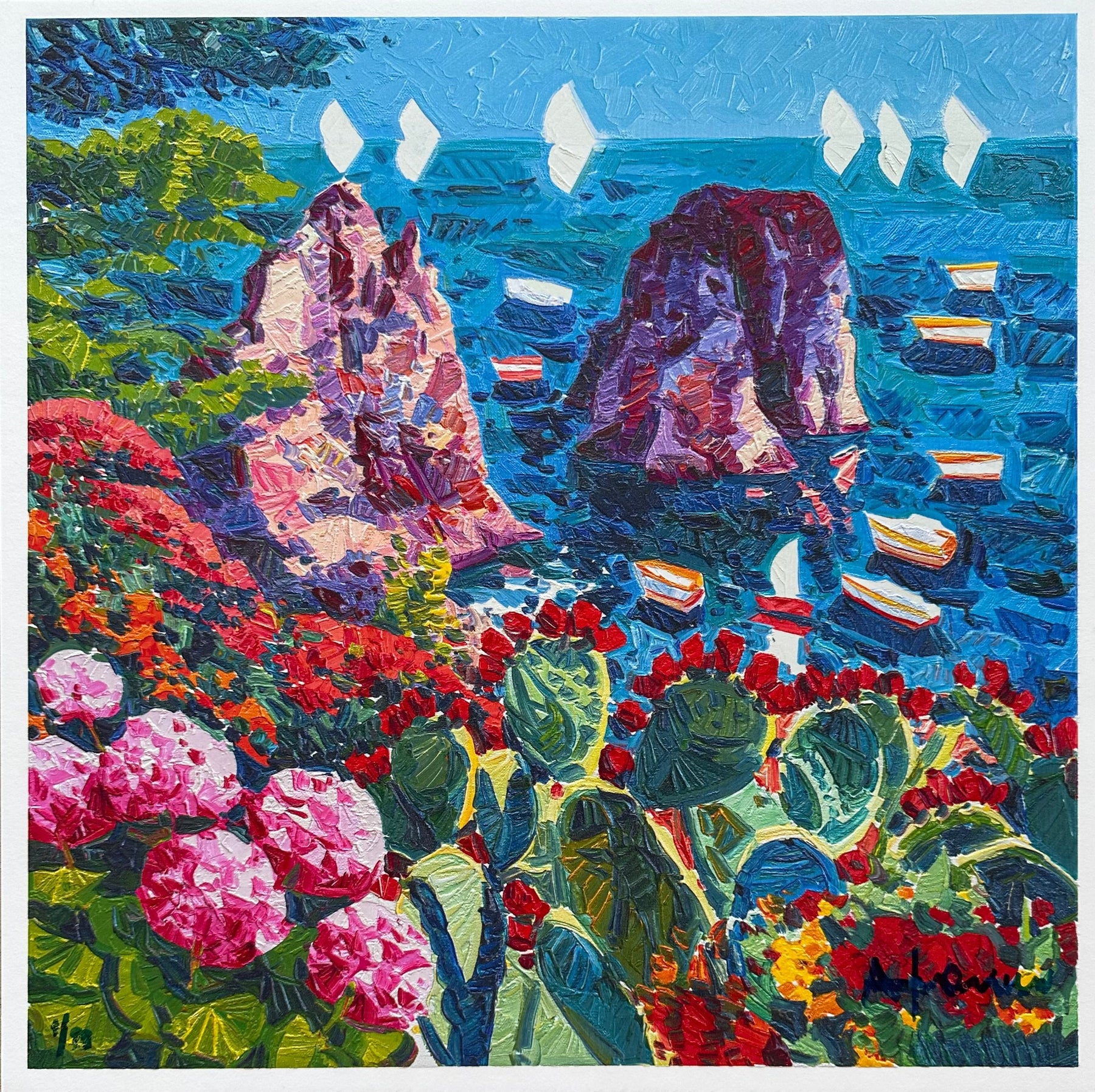 Serigrafia polimaterica su cartoncino Grand Victoria White a 40 passaggi di colore. Lo stile quasi impressionista, i colori usati accesi. Ogni lavoro dell'artista ha delle linee guida: il sole alto, la luce e il racconto semplice.