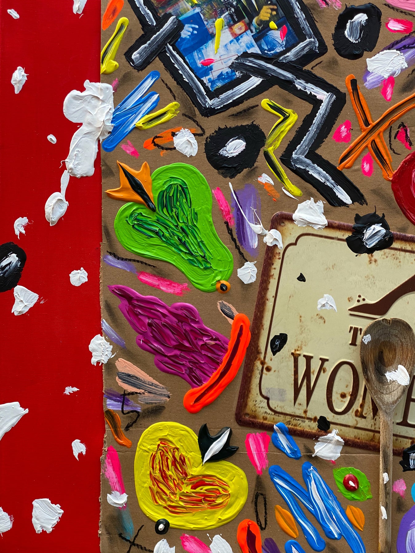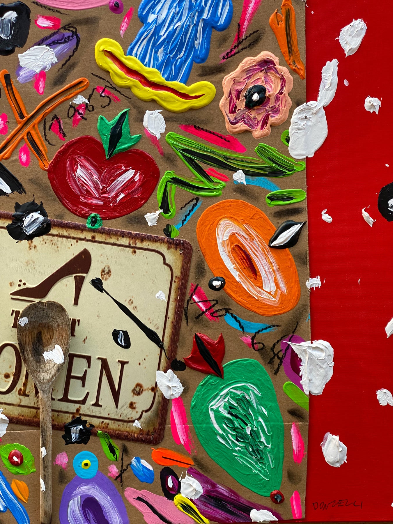 Opera unica del maestro Bruno Donzelli, la sua è una pittura narrativa, vivacissima anzi scoppiettante, che si nutre di spietate rivisitazioni, più che di citazioni.
