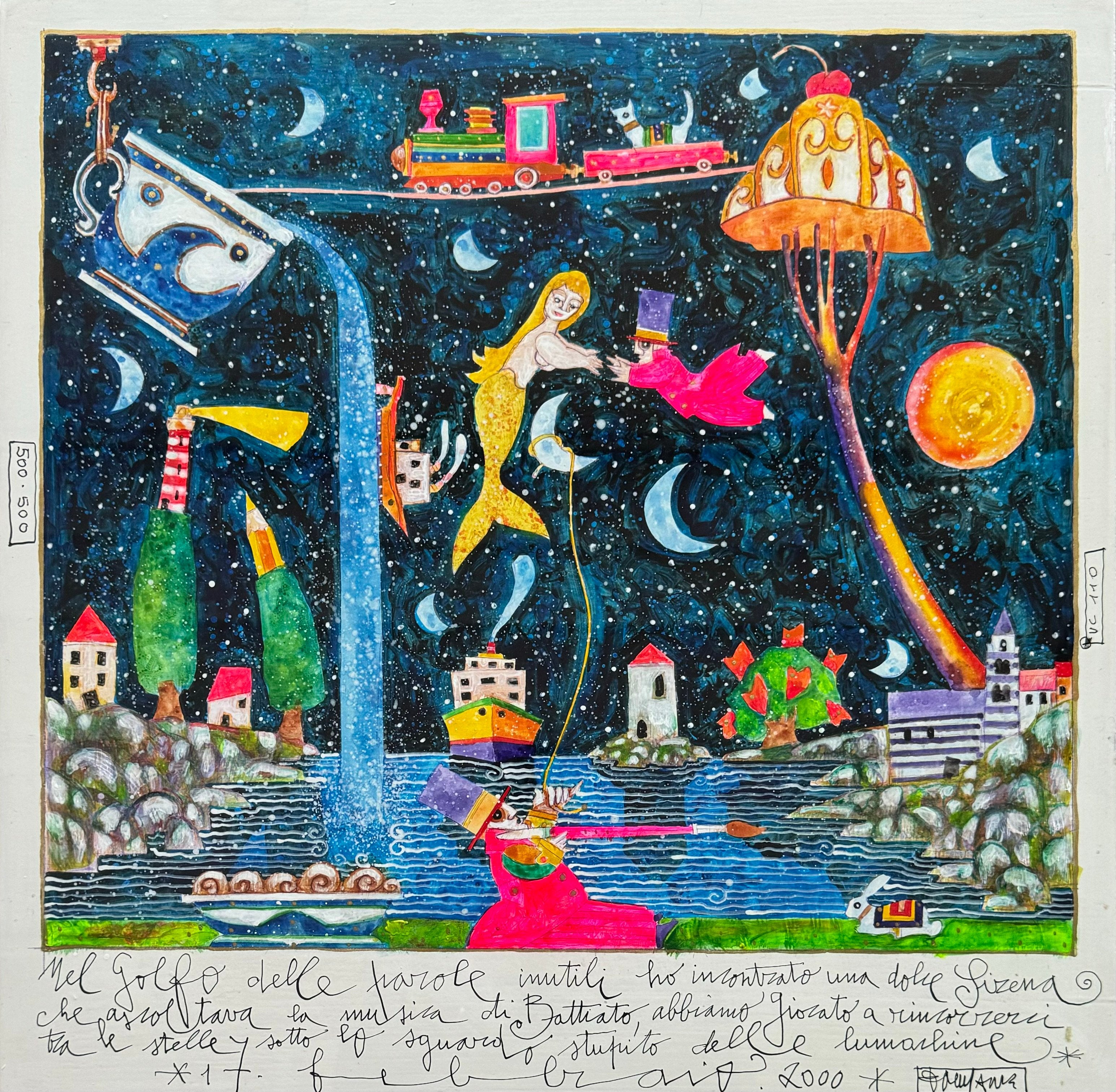 Le sue prime sperimentazioni artistiche risalgono al 1967: si tratta perlopiù di ricerche astratte su grandi campiture di colore. L’anno successivo comincia a esporre le sue opere in mostre collettive, concorsi di pittura e premi.I lavori degli anni 69-70 risentono dell’influenza della Pop Art e dei Combine Paintings di Rauschenberg: chiari i riferimenti all’America attraverso l’uso di scritte e l’inserimento di oggetti e legni.A partire dal 1971 Musante decide di fare l’artista a tempo pieno.Nel 1975 si assiste a un cambio di rotta: Musante si dedica alla pittura figurativa, inizialmente creando una serie di figure femminili ispirate a Klimt e alla Secessione Viennese. Un tema che sviscererà lungo dieci anni utilizzando le più diverse tecniche – dall’acquerello, all’olio, al collage, all’incisione – e svariati supporti – tela, legno, ceramica, lastra, carta.A poco a poco comincia anche il lavoro con la grafica e gli acquerelli dove si intravedono i primi spunti narrativi e fantastici che contraddistinguono la sua opera dal 1985 fino ad oggi: compaiono i suoi “omini” che sembrano usciti da un libro di fiabe e inseriti in contesti pieni di oggetti, personaggi e parole. I dipinti di Musante escono finalmente dalle atmosfere drammatiche e si alleggeriscono.Nelle opere di Francesco Musante, i buffi protagonisti fluttuano in atmosfere surreali, in cui l’esperienza visiva è affiancata da frasi poetiche che talvolta evocano personaggi come Fabrizio de Andrè, Pablo Neruda e Hans Christian Andersen, celebri per le loro composizioni a carattere romantico. Le serigrafie e le opere uniche dell’artista Musante sono spesso arricchite da dettagli polimaterici, collage e glitter, e sono realizzate in numerosi formati. Tra questi ultimi il più diffuso è la serigrafia 8x10 cm, una preziosa carta che rappresenta un determinato soggetto ad esempio il Portafortuna. Le opere di Musante sono largamente richieste da un pubblico privato e istituzionale, pertanto le sue quotazioni medio-alte sono stabili.