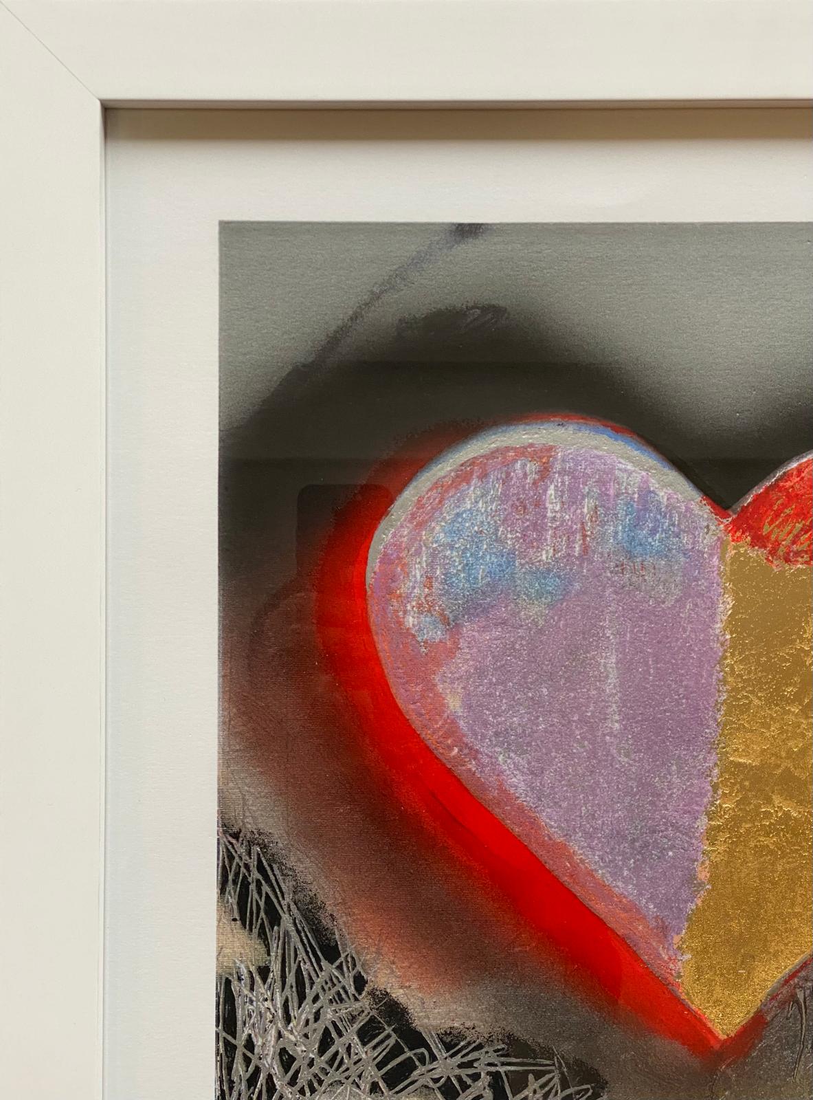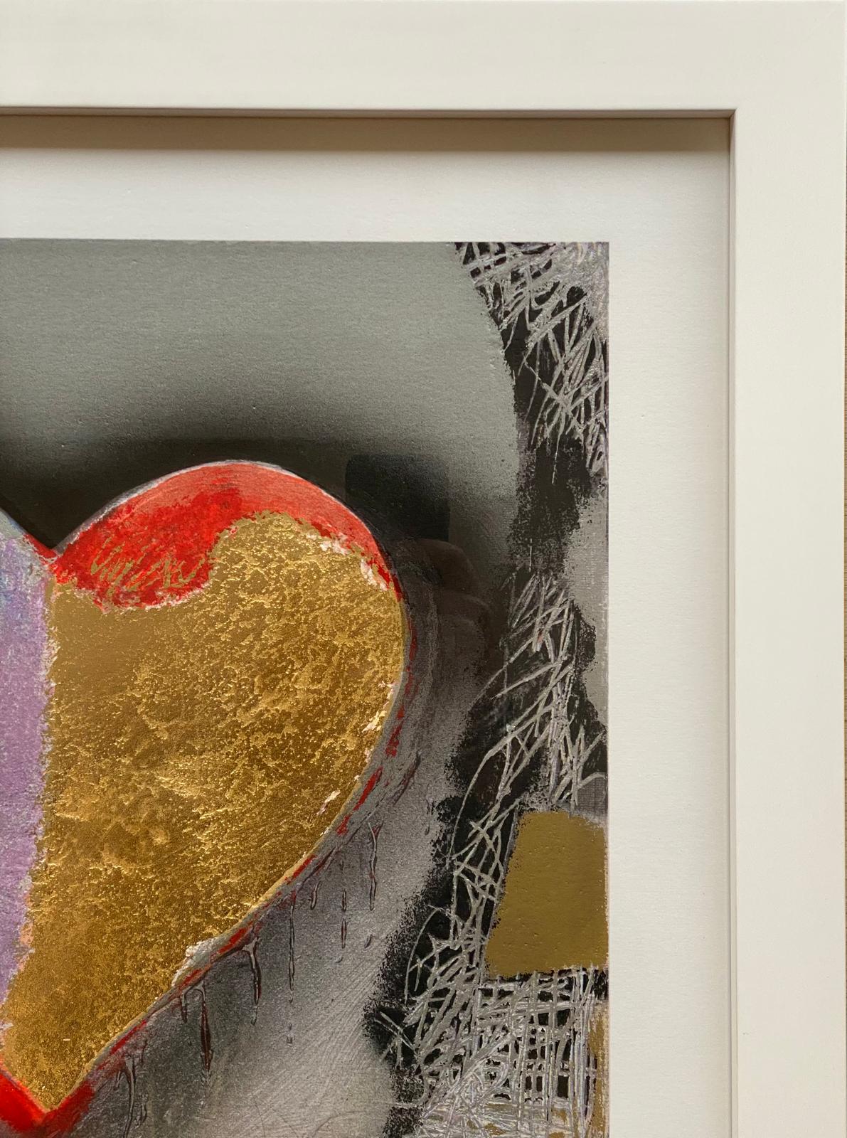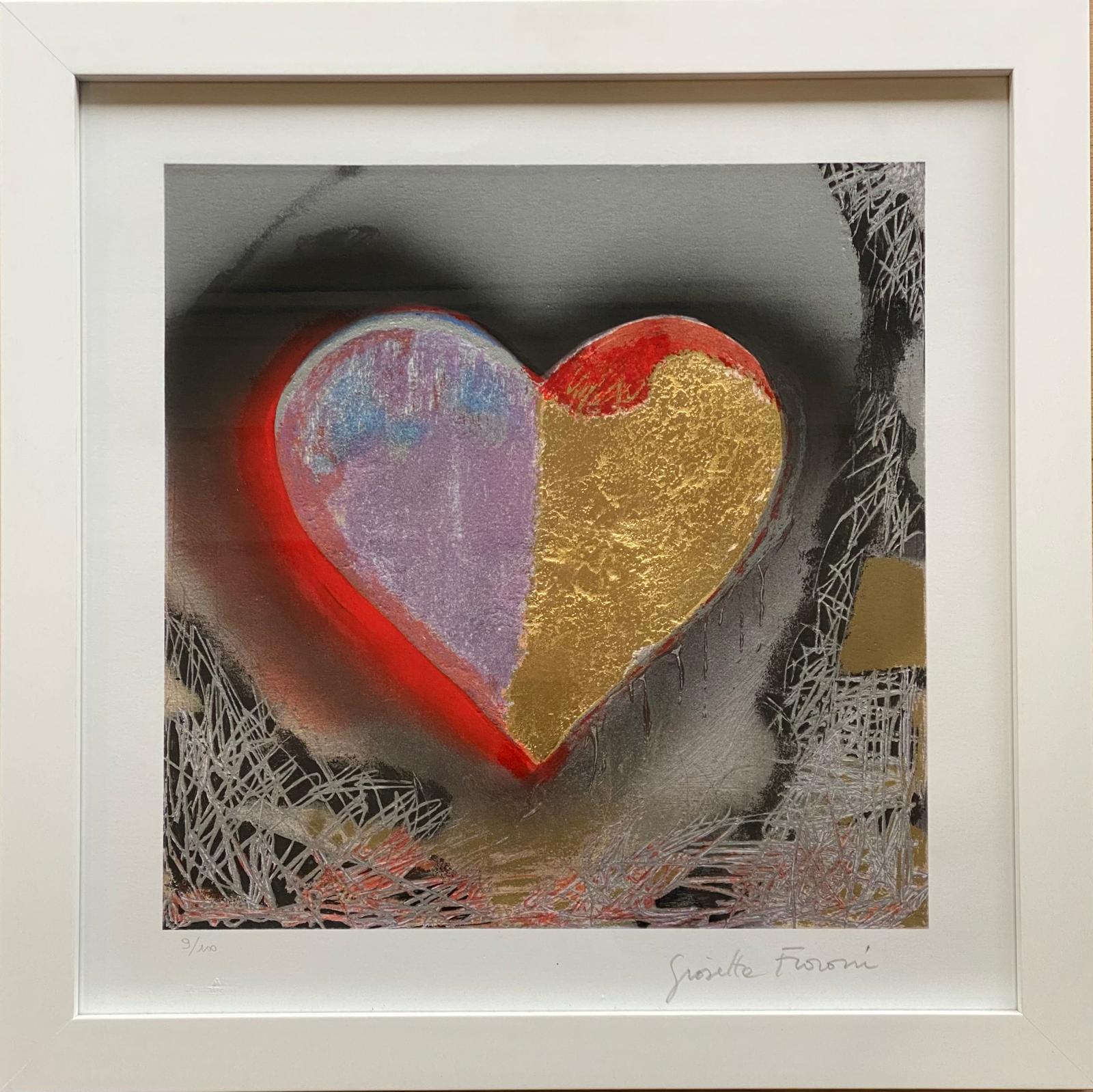 Serigrafia polimaterica su carta con numerosissimi interventi manuali in foglia oro, collage e materie.