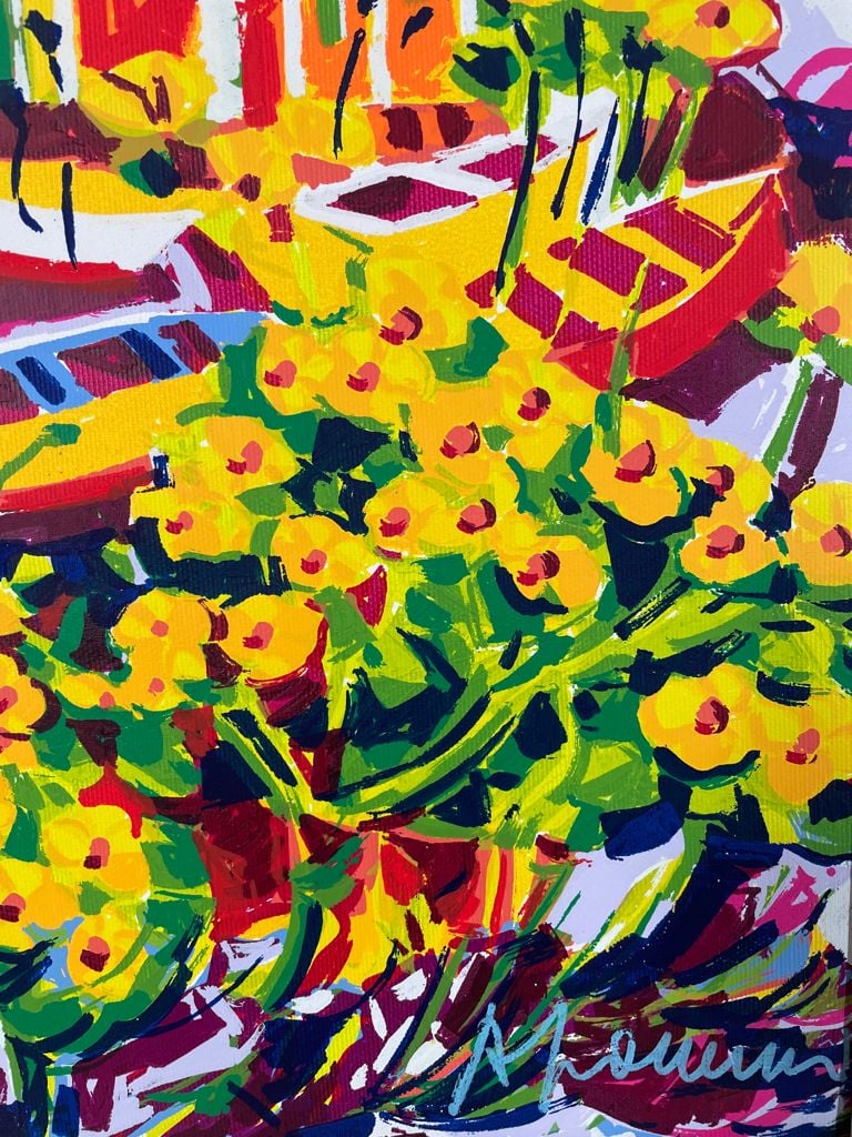 Serigrafia realizzata interamente a mano a 36 passaggi di colore. Lo stile quasi impressionante, i colori usati accesi. Ogni lavoro dell'artista ha delle linee guida: il sole alto, la luce e il racconto semplice.
