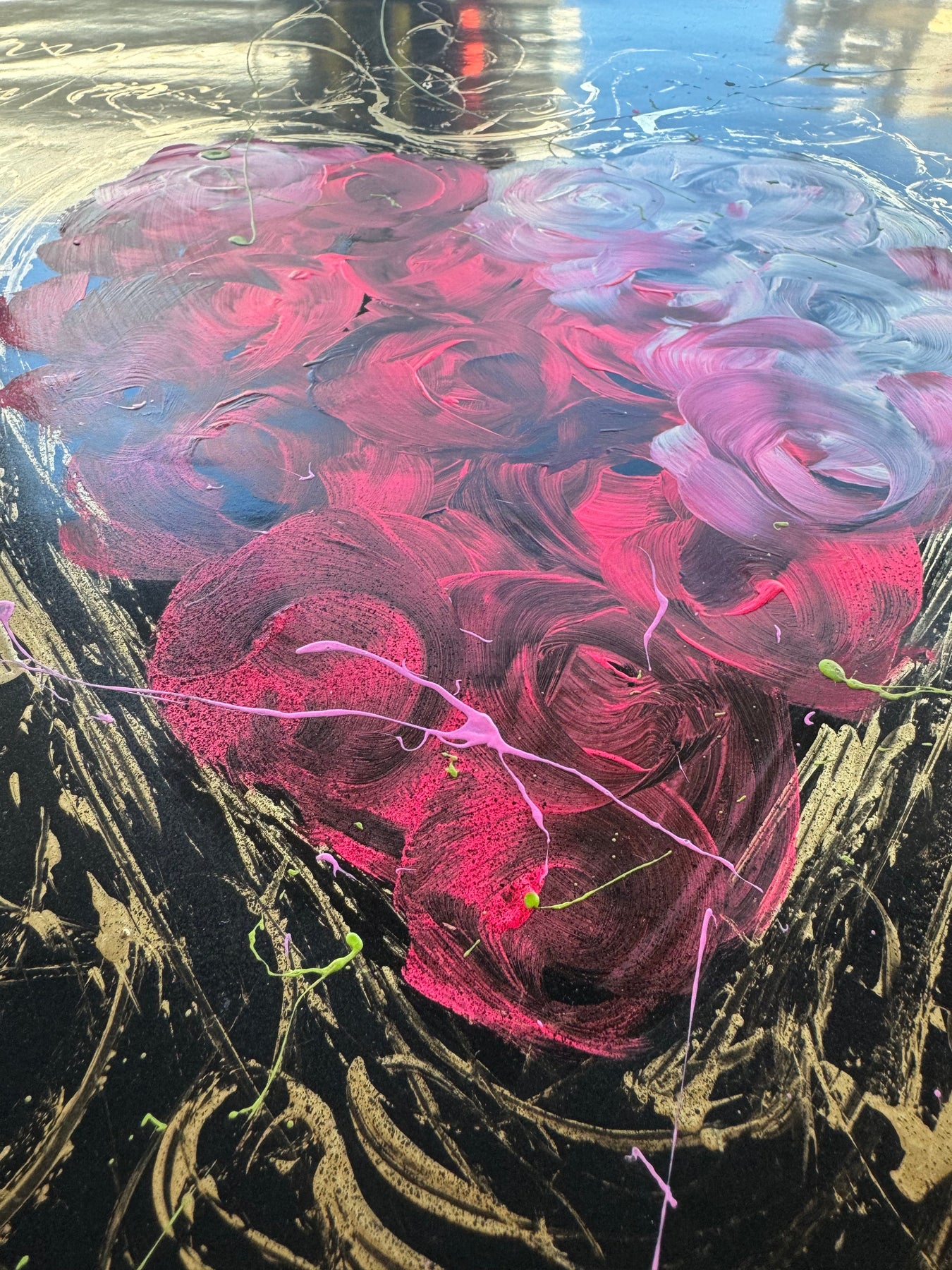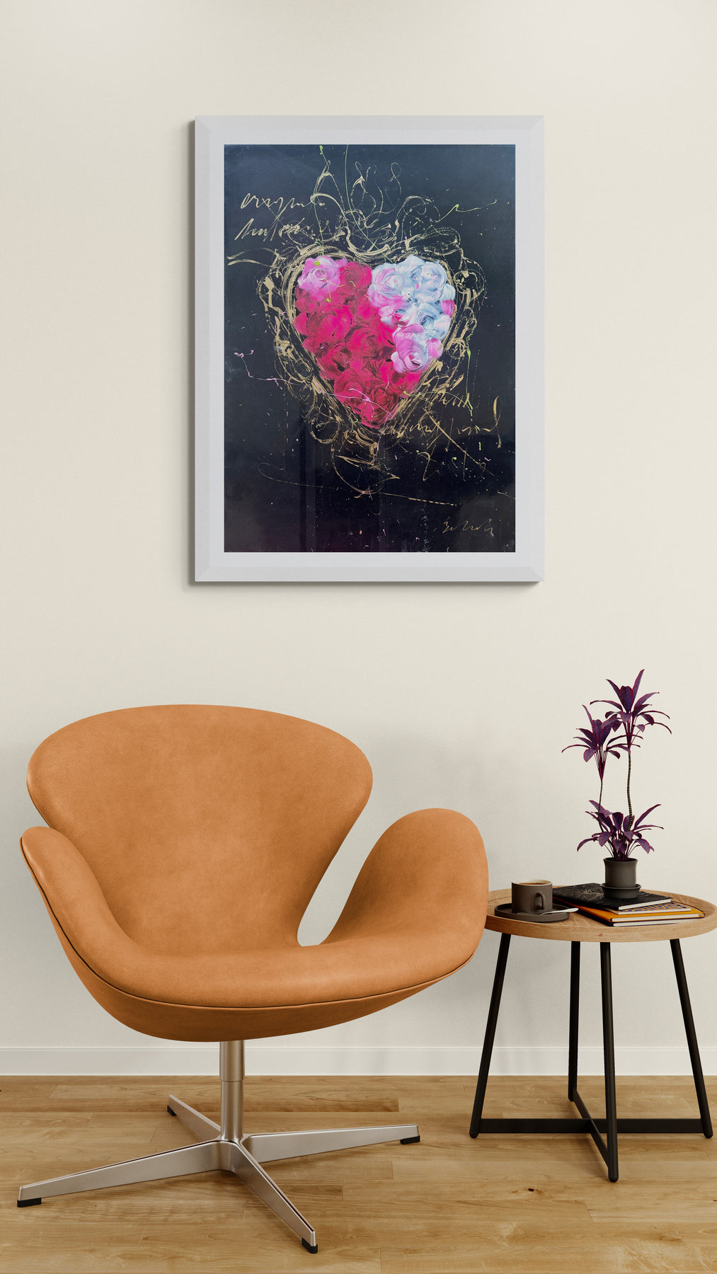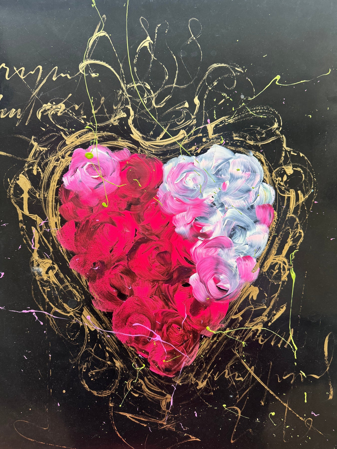 Questa particolare opera gioca con un’esplosione di colori e trame che seducono l'occhio e l'anima. Il cuore al centro, avvolto da tonalità vivaci e pennellate audaci, sembra pulsare di vita propria. Riflette un dialogo interiore tra passione e quiete, tra la staticità della forma e il dinamismo del sentimento.