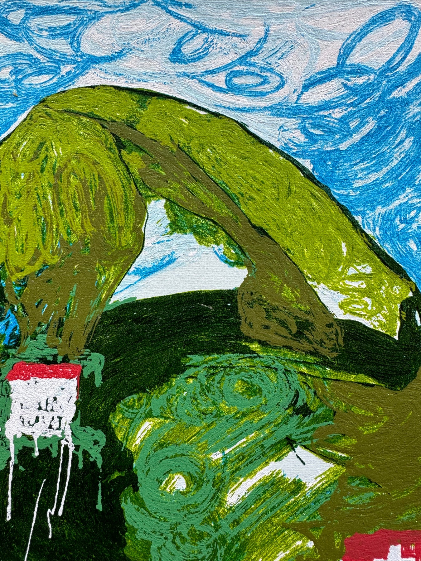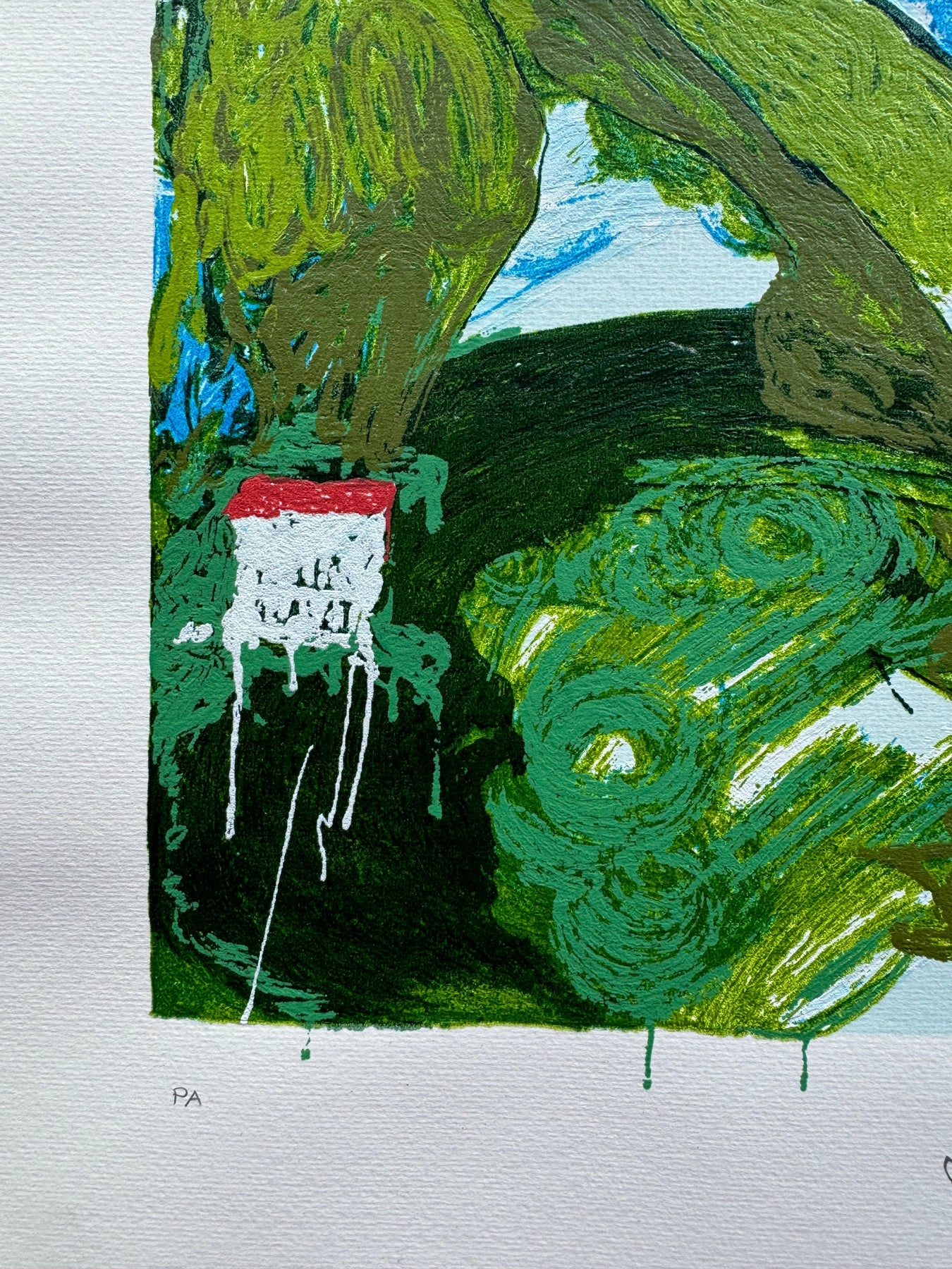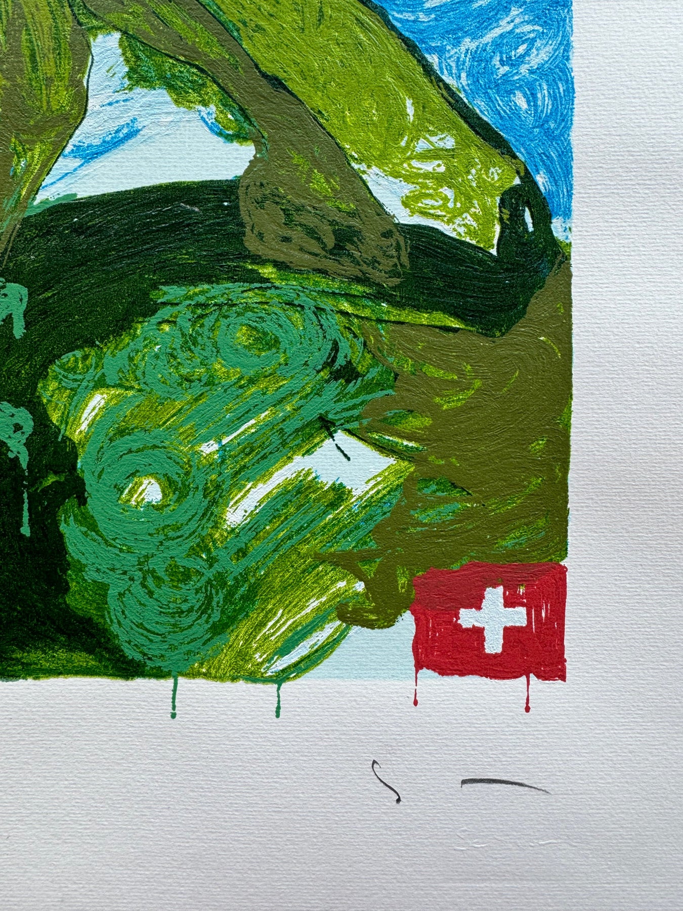 Casa Svizzera, 1997, serigrafia materica a smalto, 325x240 mm. Stampa a 30 colori su carta in formato 500x350 mm con timbro a secco della firma di schifano. Tiratura di 199 esemplari con numeri arabi (da 1/199 a 199/199), C con numeri romani (da I/C a C/C), P.A. 100 e 100 hors commerce (da H.C. 1/100 a H.C 100/100)