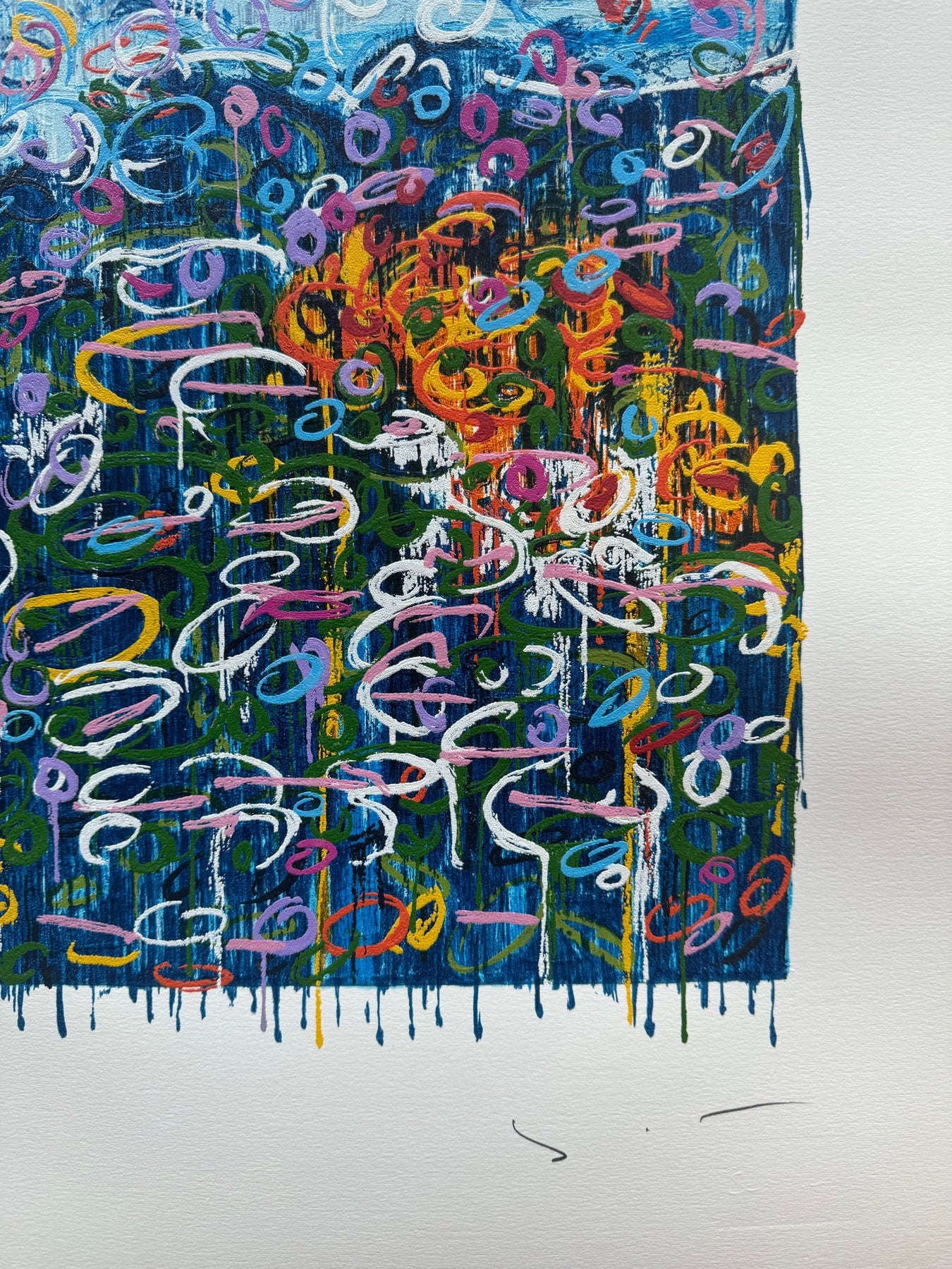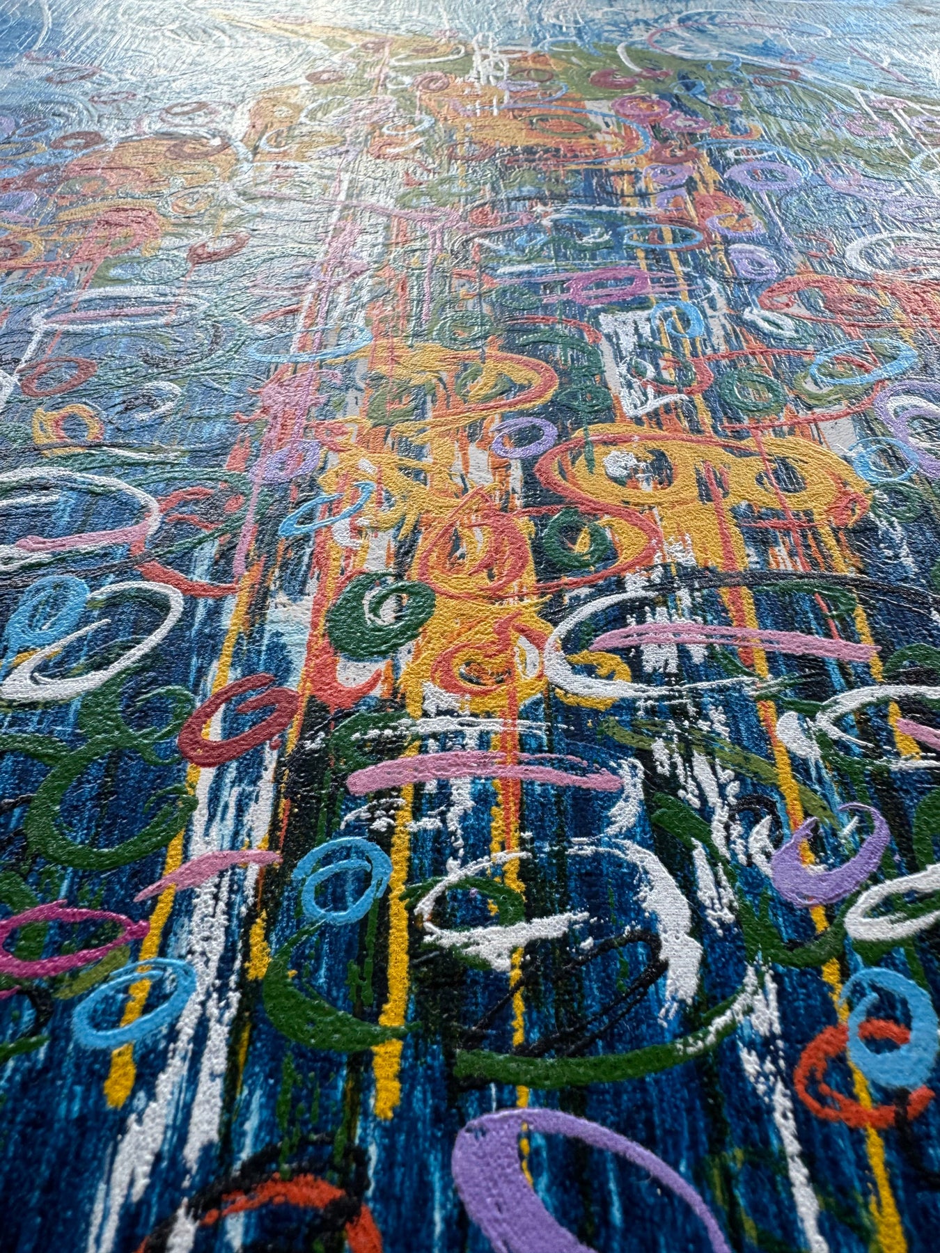 Osservando l'opera, è impossibile non immergersi in un universo allegro e giocoso, dove il disordine apparente si trasforma in pura armonia. Le linee ondulate e i cerchi danzanti ci invitano a scoprire nuovi dettagli ad ogni sguardo, offrendo una sensazione di serenità e al contempo di entusiasmo pulsante.