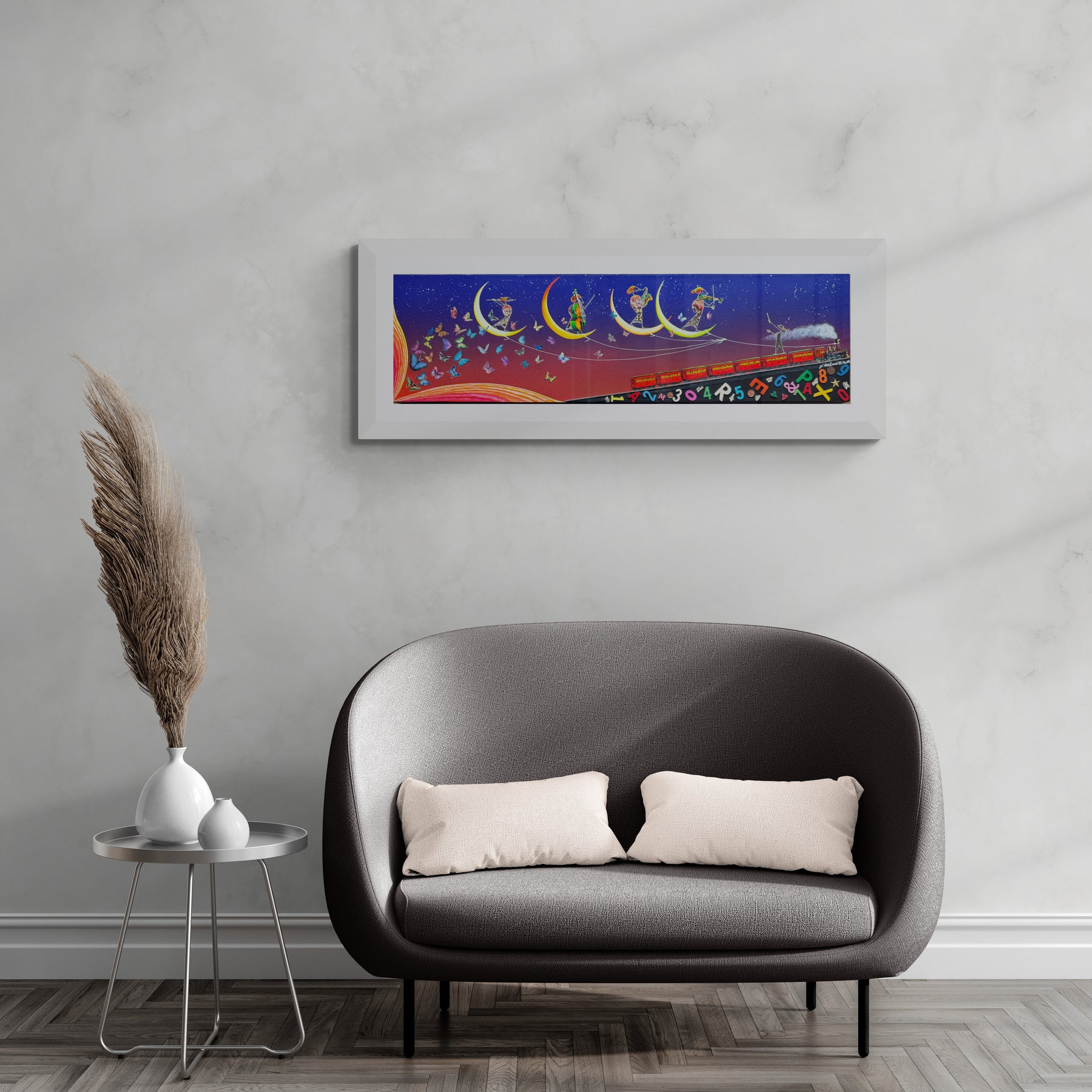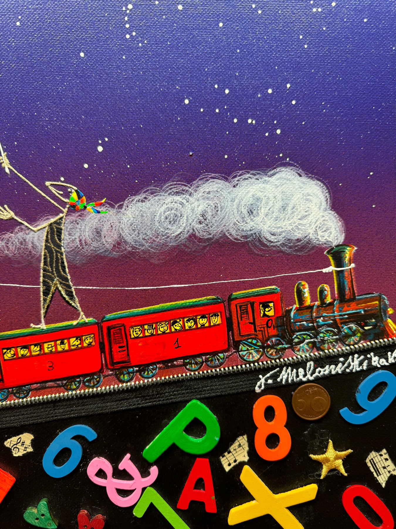 Questo pezzo esplode di vita e dinamismo. Un treno attraversa un cielo notturno punteggiato di stelle, mentre farfalle e numeri sembrano danzare in una sinfonia di colori. Le figure, sospese su sottili lune crescenti, sembrano persino fluttuare nell'aria, come note di una musica invisibile.