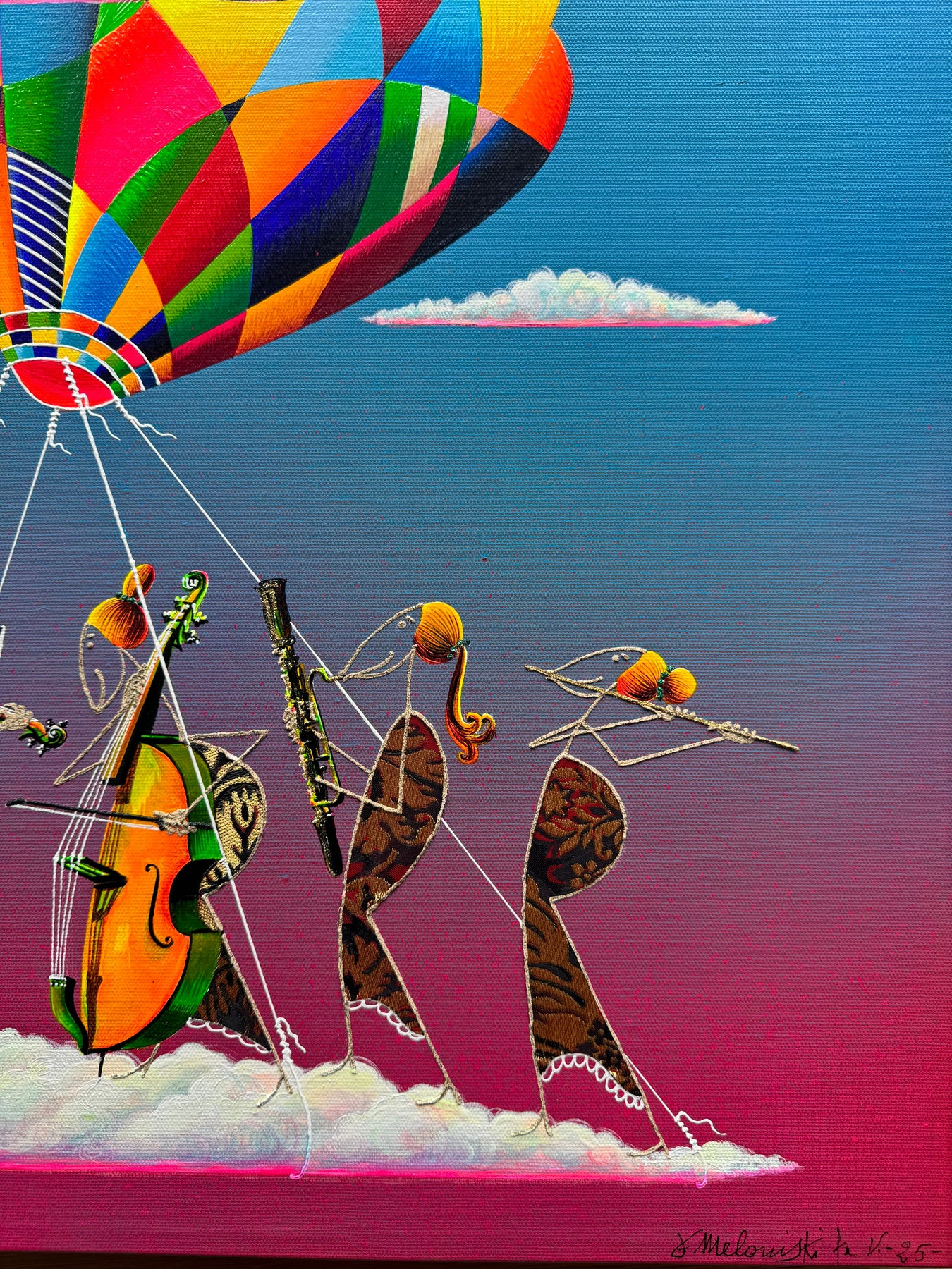 In quest'opera, un gruppo di musicisti sembra sorvolare un cielo vibrante di colori. Il pallone aerostatico sopra di loro diventa un simbolo di libertà e fantasia, intrecciando il sogno di volare con la melodia suonata. Il contrasto tra il cielo nitidissimo e le figure stilizzate offre un’impressione di movimento armonioso, come se la musica stessa sollevasse il mondo nelle sfere dell’immaginazione.