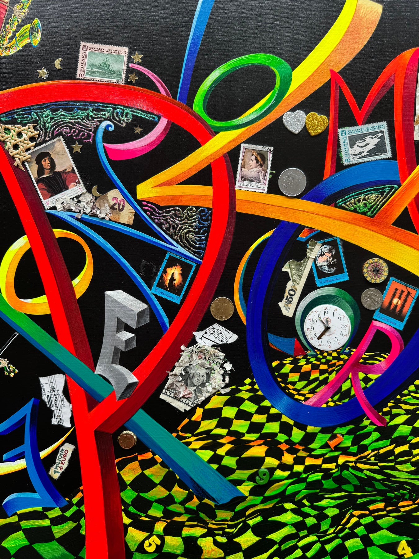 La composizione cattura l'attenzione con il suo dinamismo visivo, un intreccio di elementi e colori che vibrano in una danza ipnotica. Le figure fluttuanti suggeriscono una tensione tra l'ordine e il caos, evocando la forza invisibile che il denaro esercita nella nostra società.