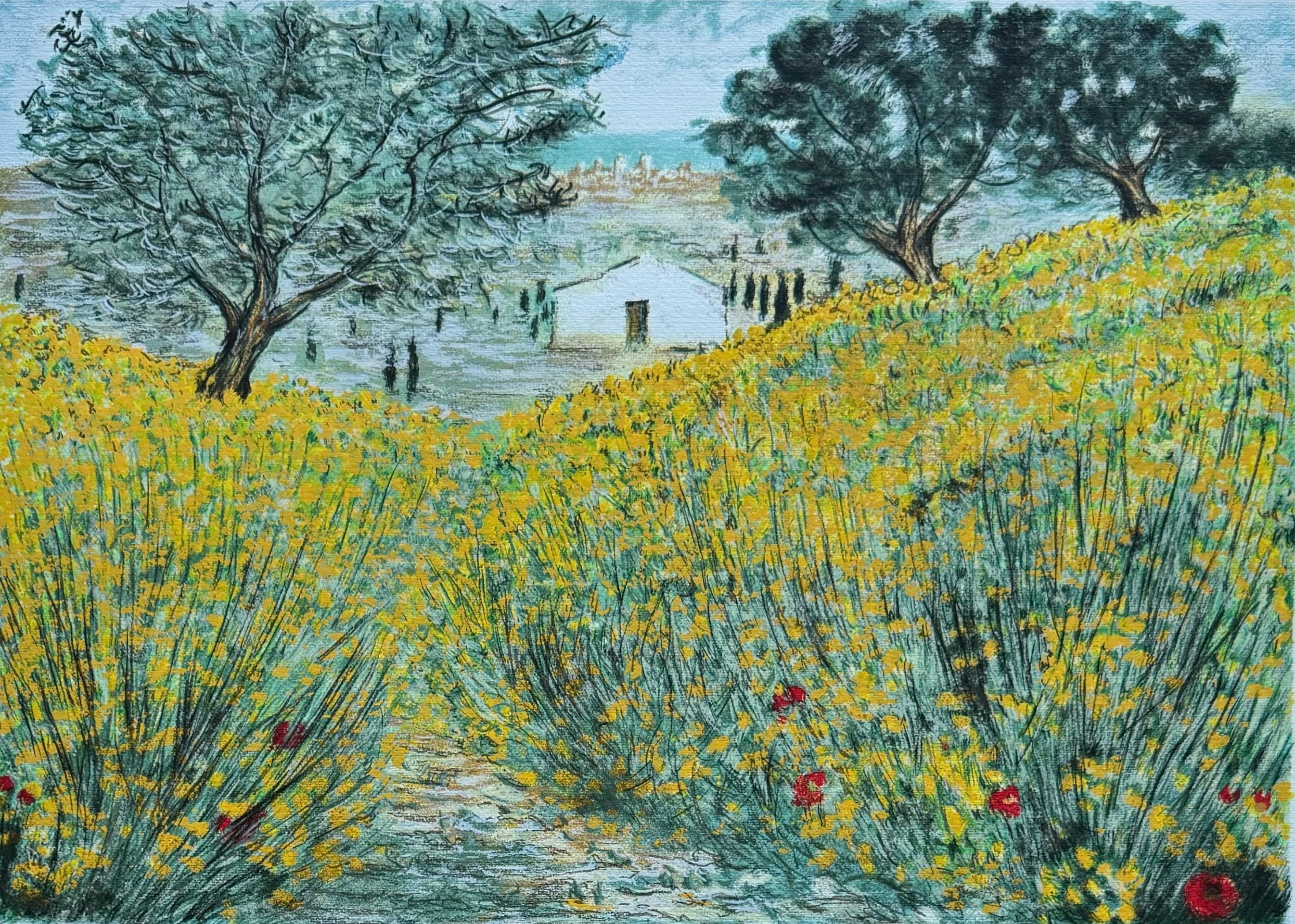 Litografia di fine anni '80 realizzata su carta della Cartiera Magnani di Pescia, con timbro a secco della firma di Michele Cascella e la filigrana "Torcular".