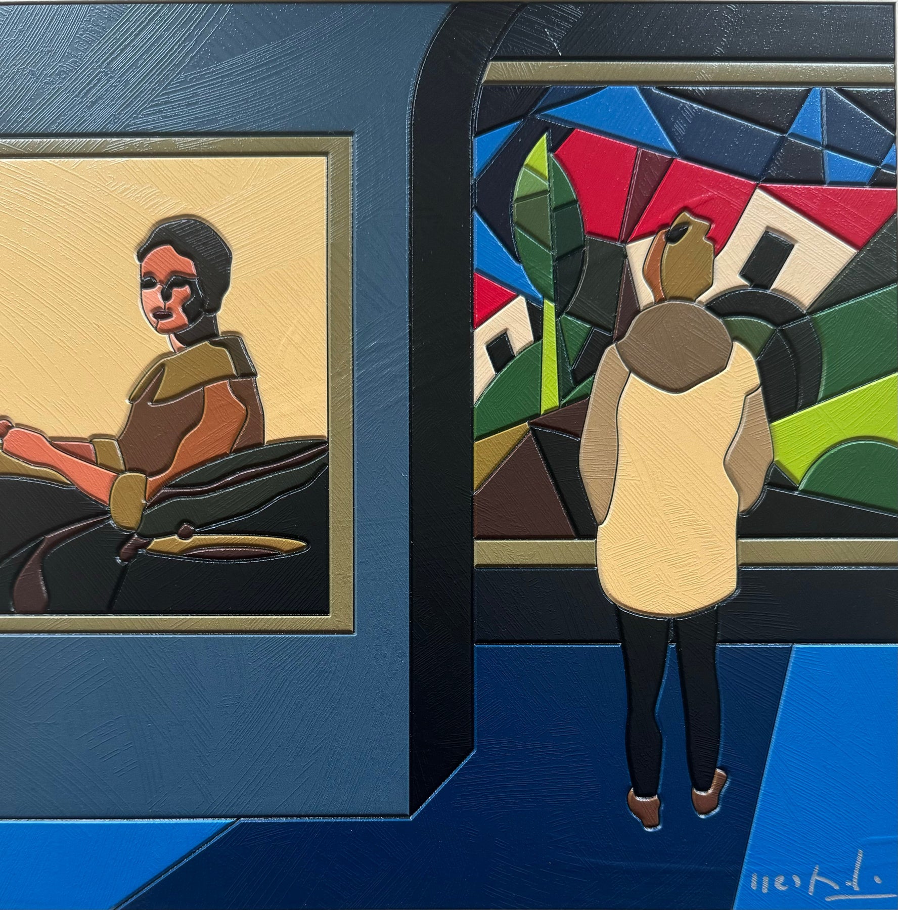 In quest'opera, si percepisce una forte tensione tra l'intimità e l'anonimato, simbolizzata da figure stilizzate che sembrano danzare in un gioco di sguardi e movimenti. Emerge un contrasto di toni caldi e freddi, che trasmettono la complessità delle emozioni legate all'amore. Osservandola, si è catturati da un senso di sospensione e continuo movimento, dove l'interazione umana diventa arte e pensiero.