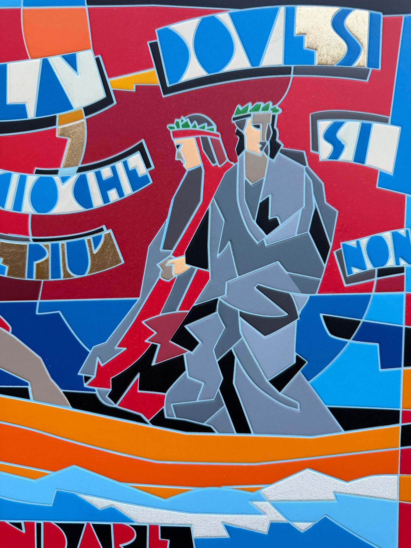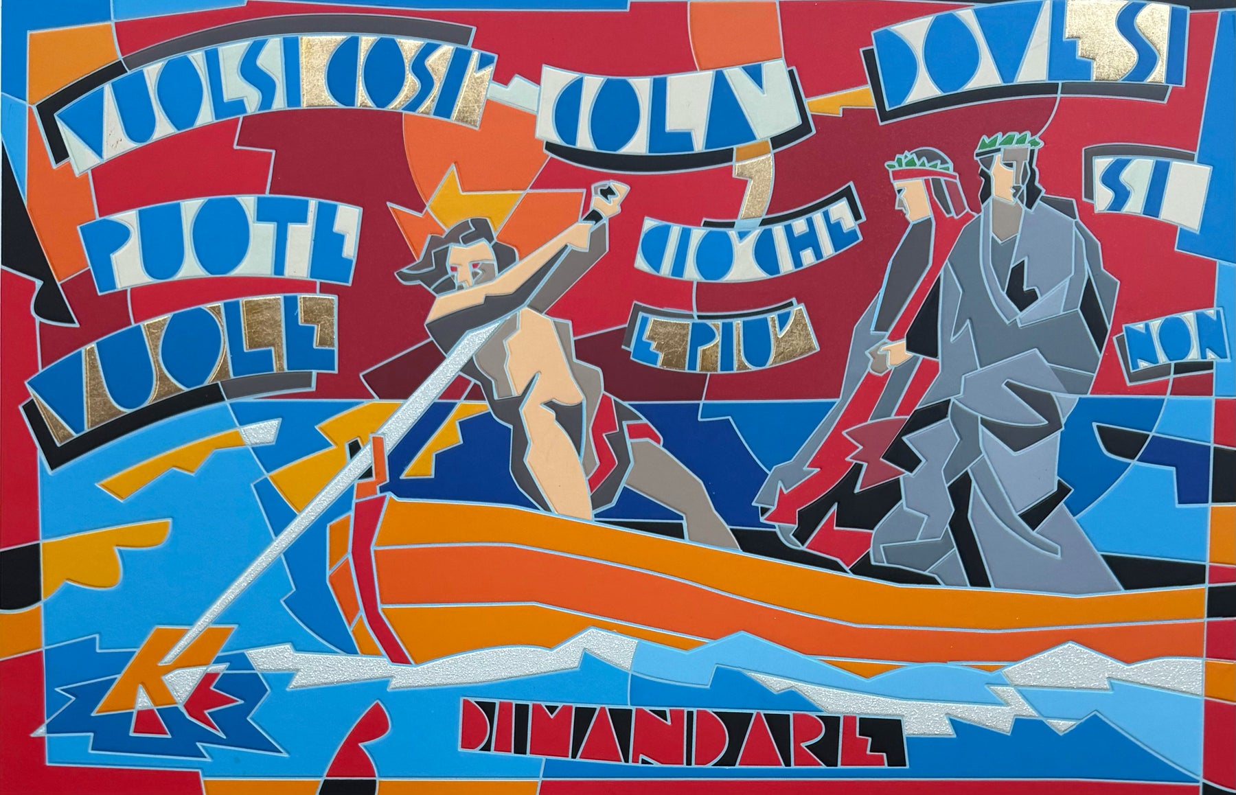 Opera del maestro Ugo Nespolo, realizzata con la sua inconfondibile tecnica di sintesi pittorica e formale.