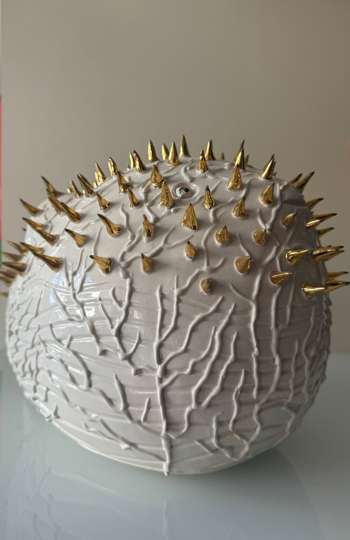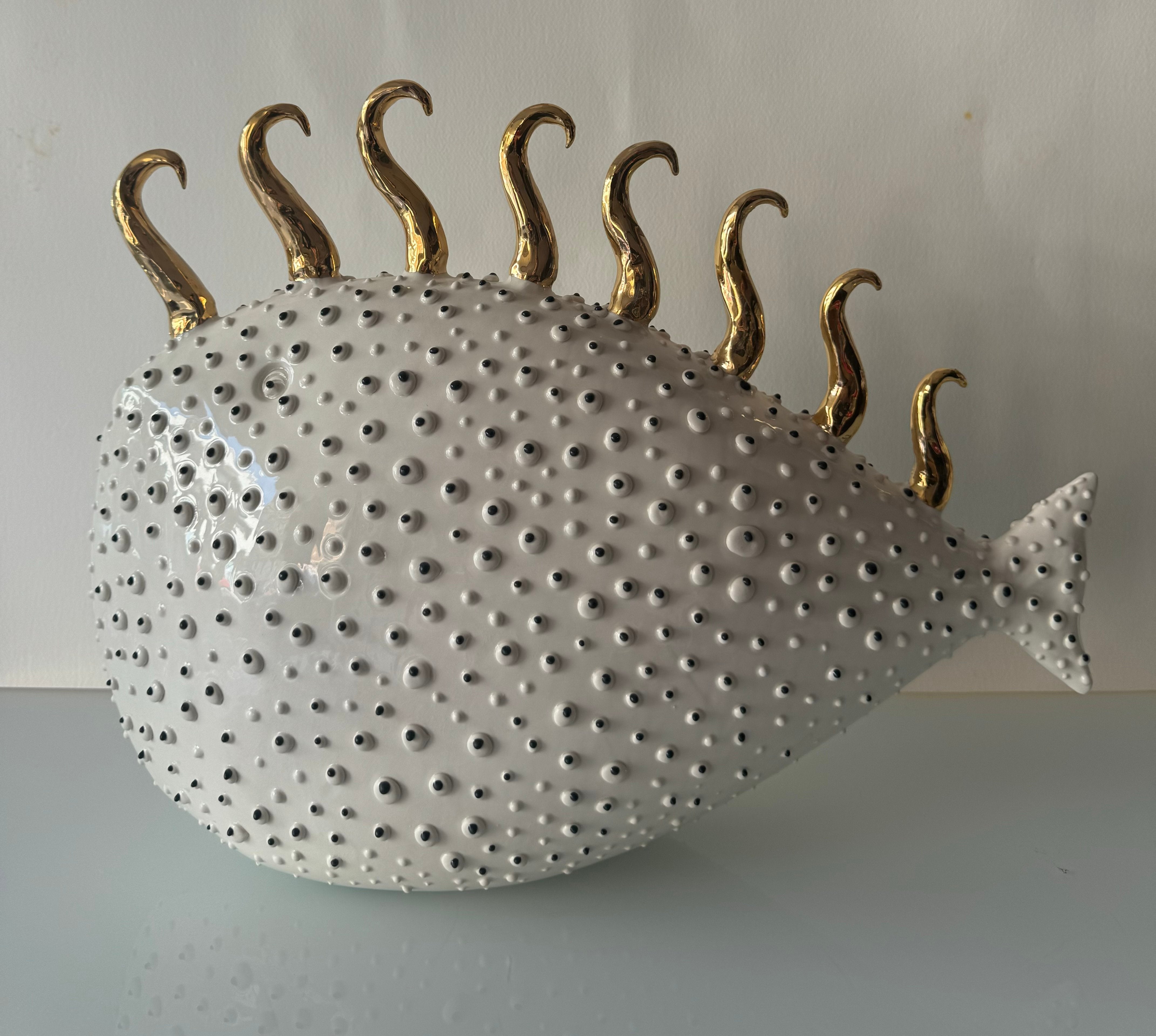 Scultura in terra bianca dipinta a mano, lustrata con oro zecchino.