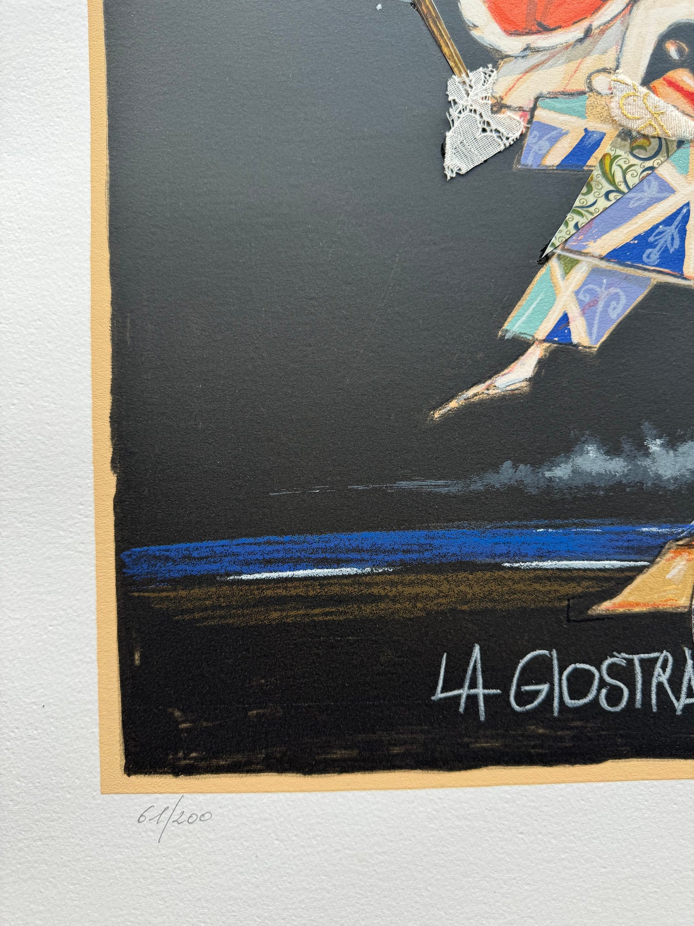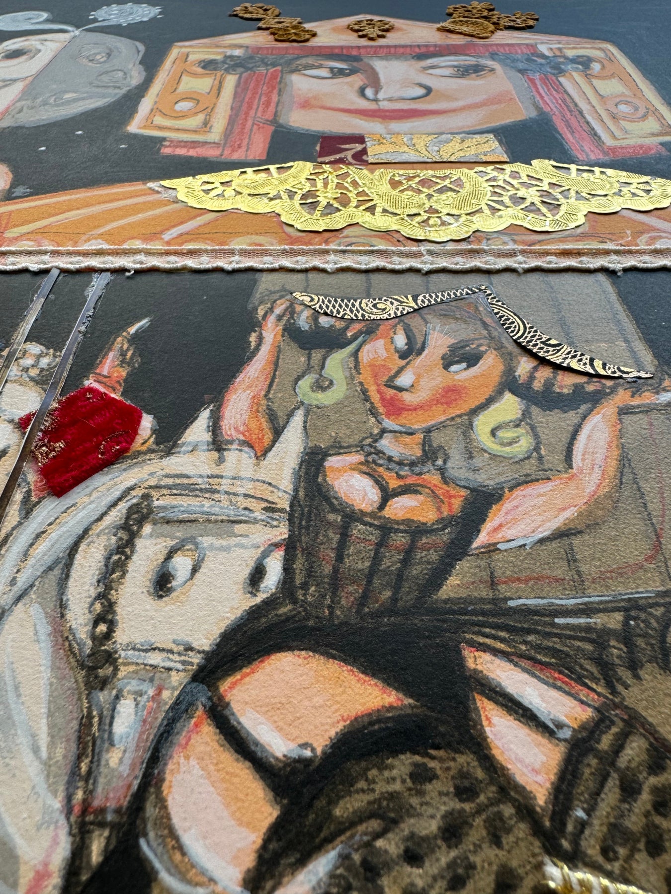 Serigrafia polimaterica con interventi manuali in stoffe e collage.