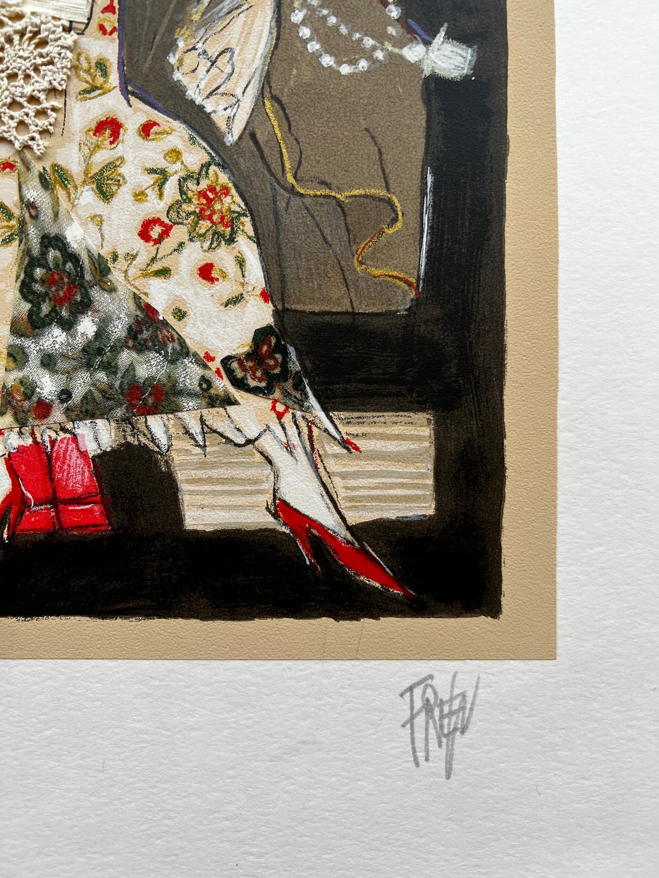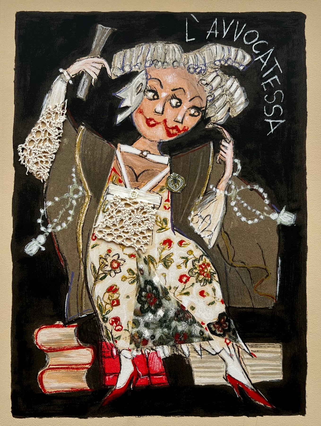 Serigrafia polimaterica con interventi manuali in stoffe e collage.