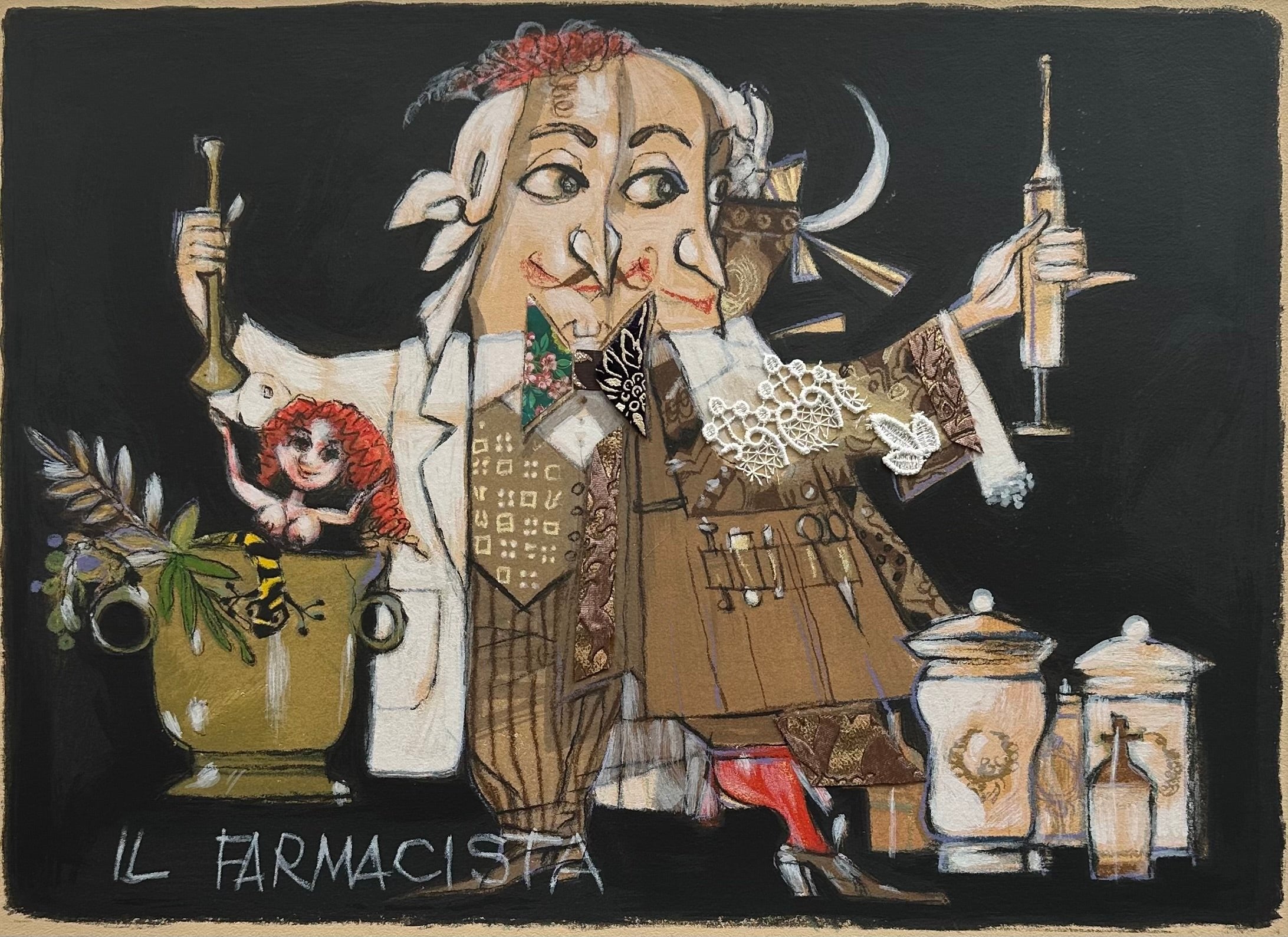 Serigrafia polimaterica con interventi manuali in stoffe e collage.