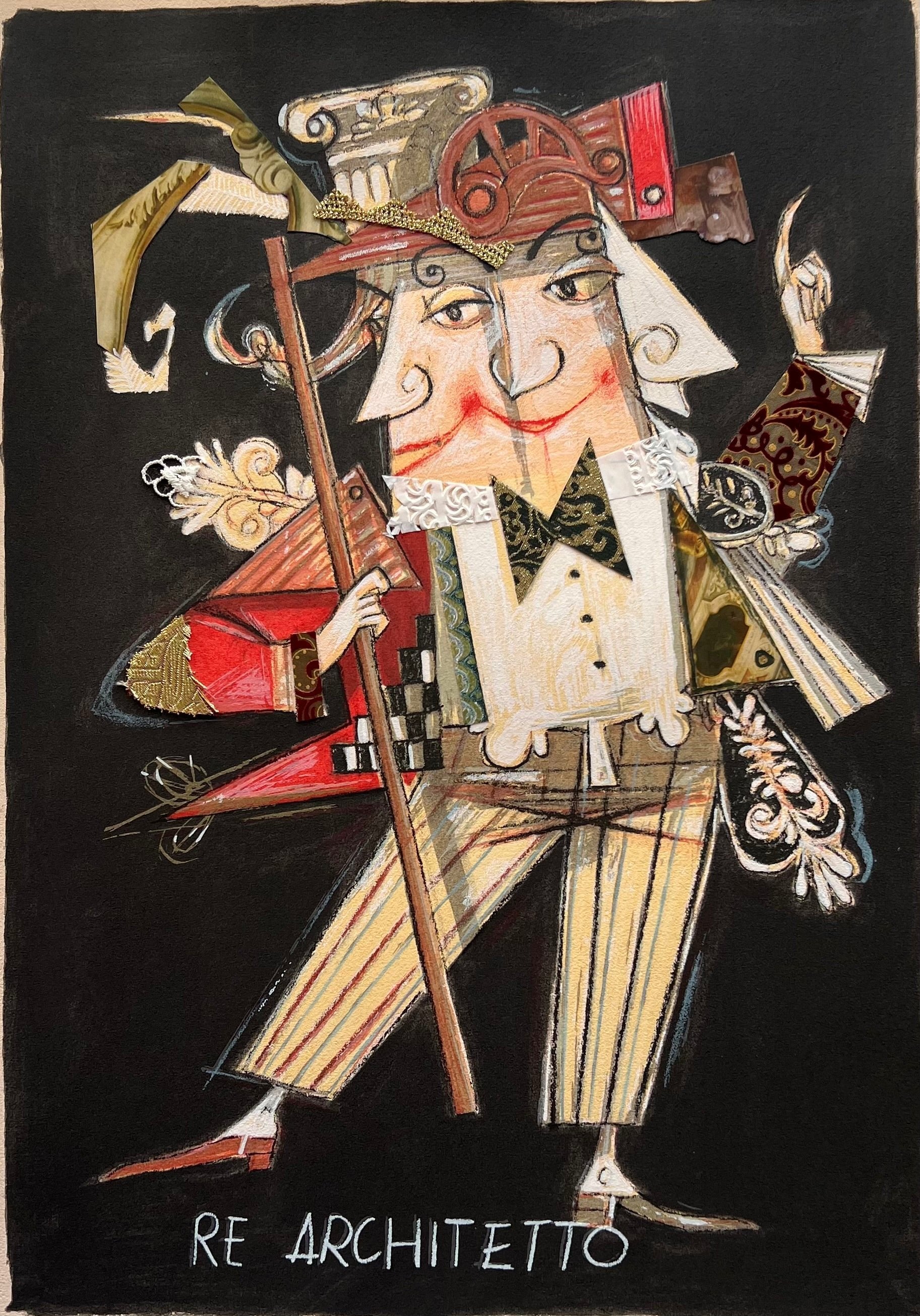 Serigrafia polimaterica con interventi manuali in stoffe e collage.