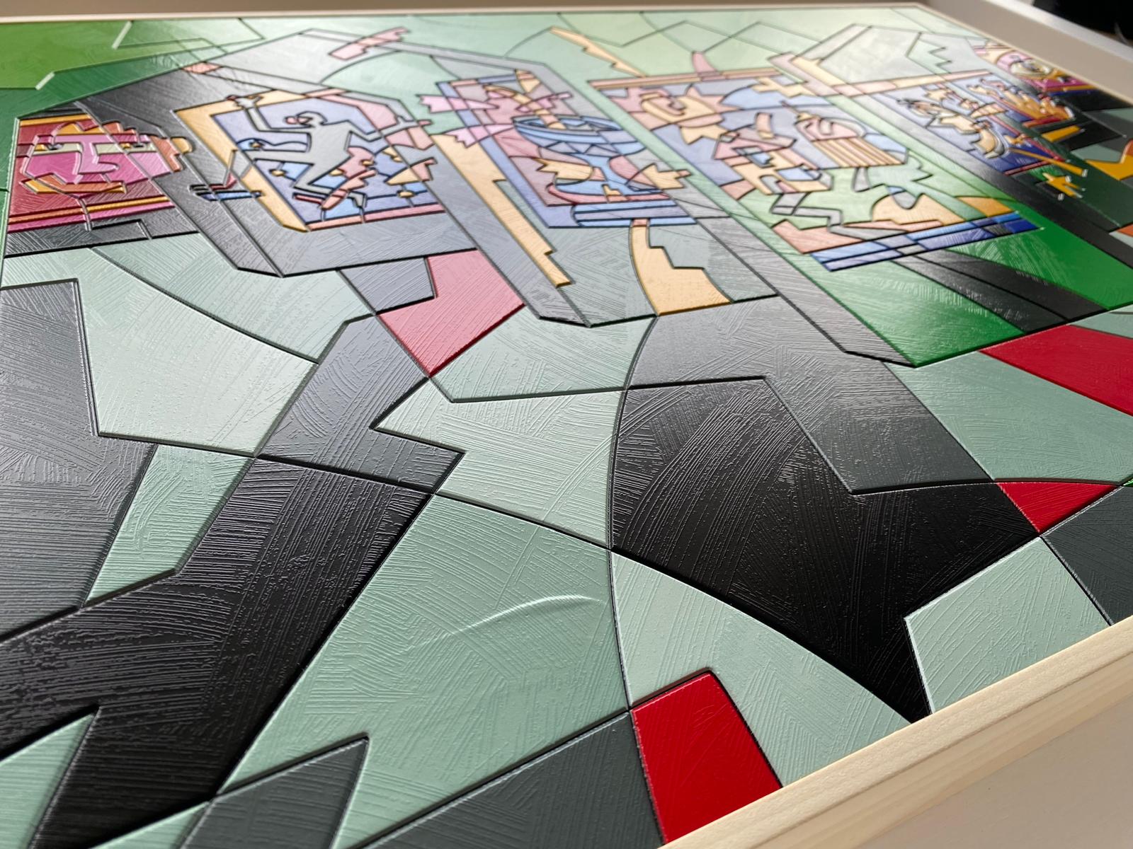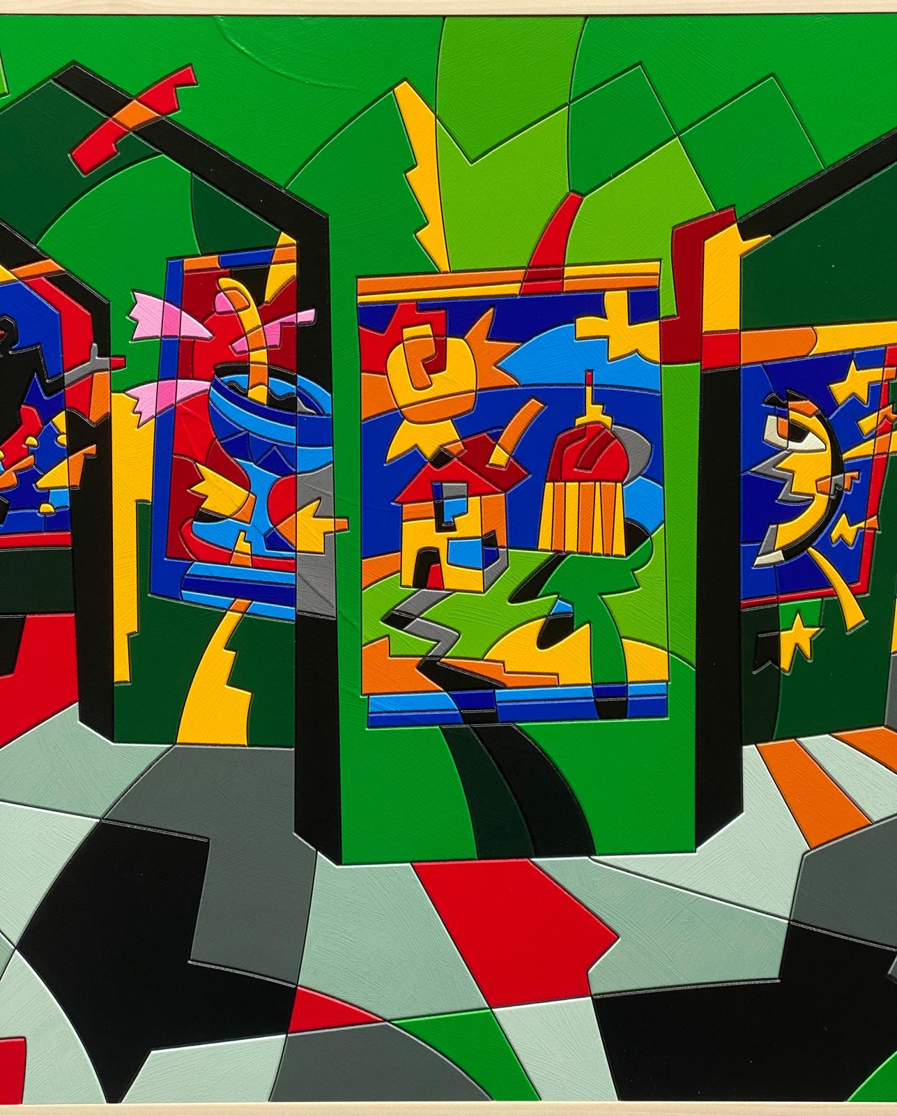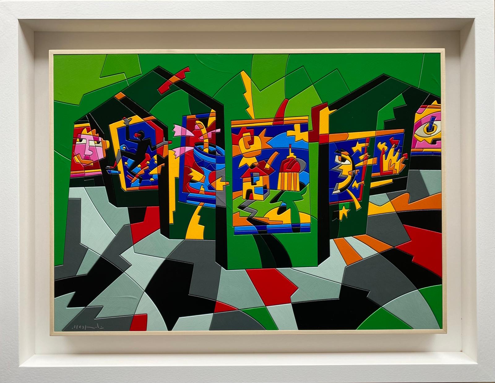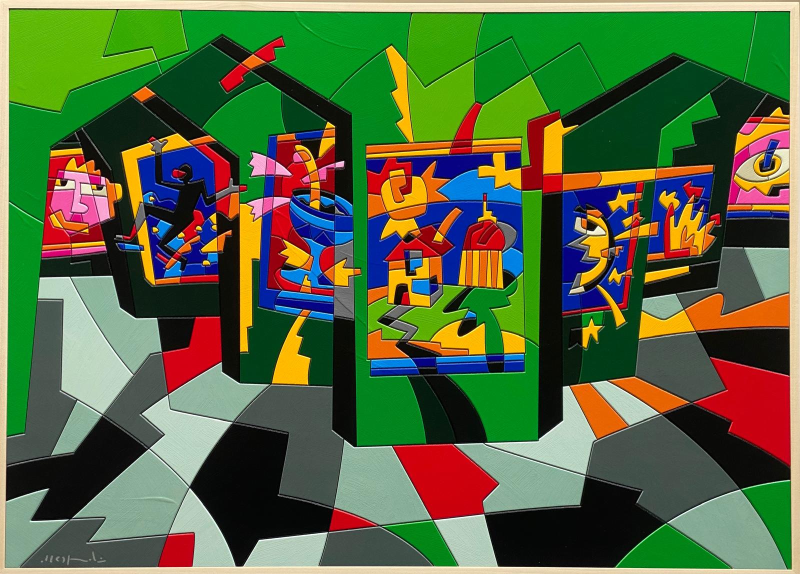Opera unica di grande qualità del maestro Ugo Nespolo, acrilico su legno, con autentica firmata di pugno dall’artista.