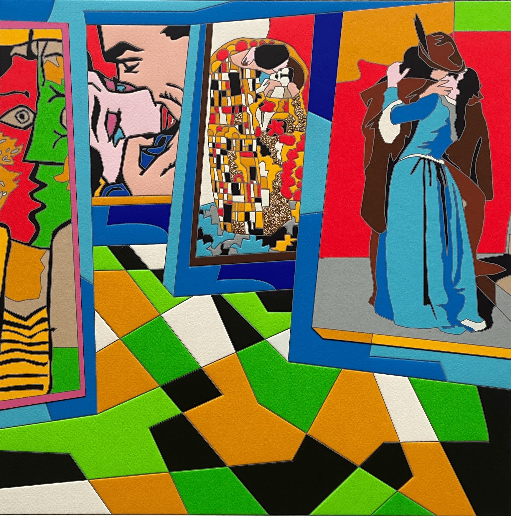 Serigrafia realizzata interamente a mano a 46 passaggi di colore con interventi in carborundum, collage floccaggi, stoffe e passaggio calcografico a secco.