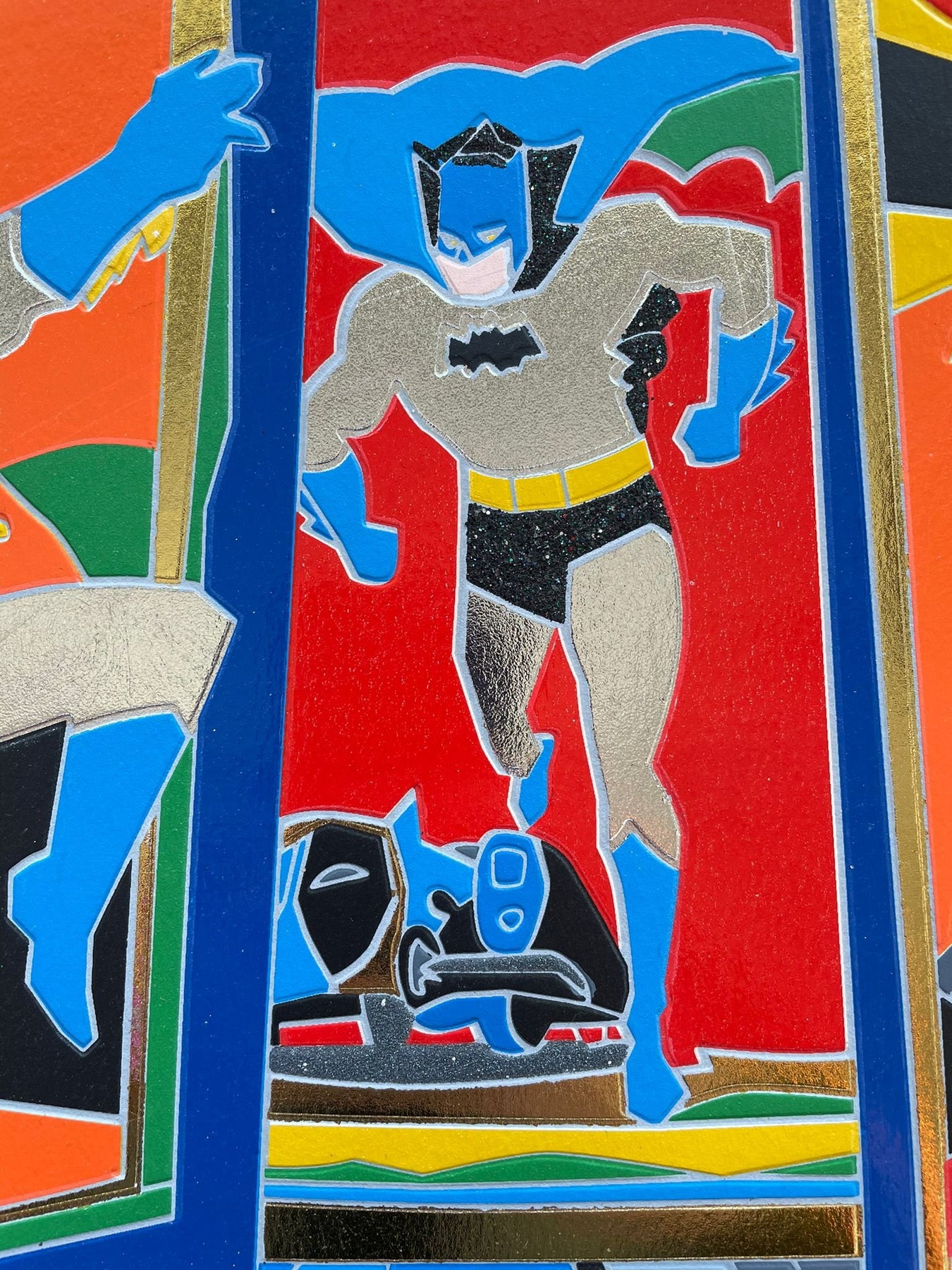 Serigrafia realizzata interamente a mano a 46 passaggi di colore con interventi in carborundum, collage floccaggi, foglia oro e passaggio calcografico a secco.