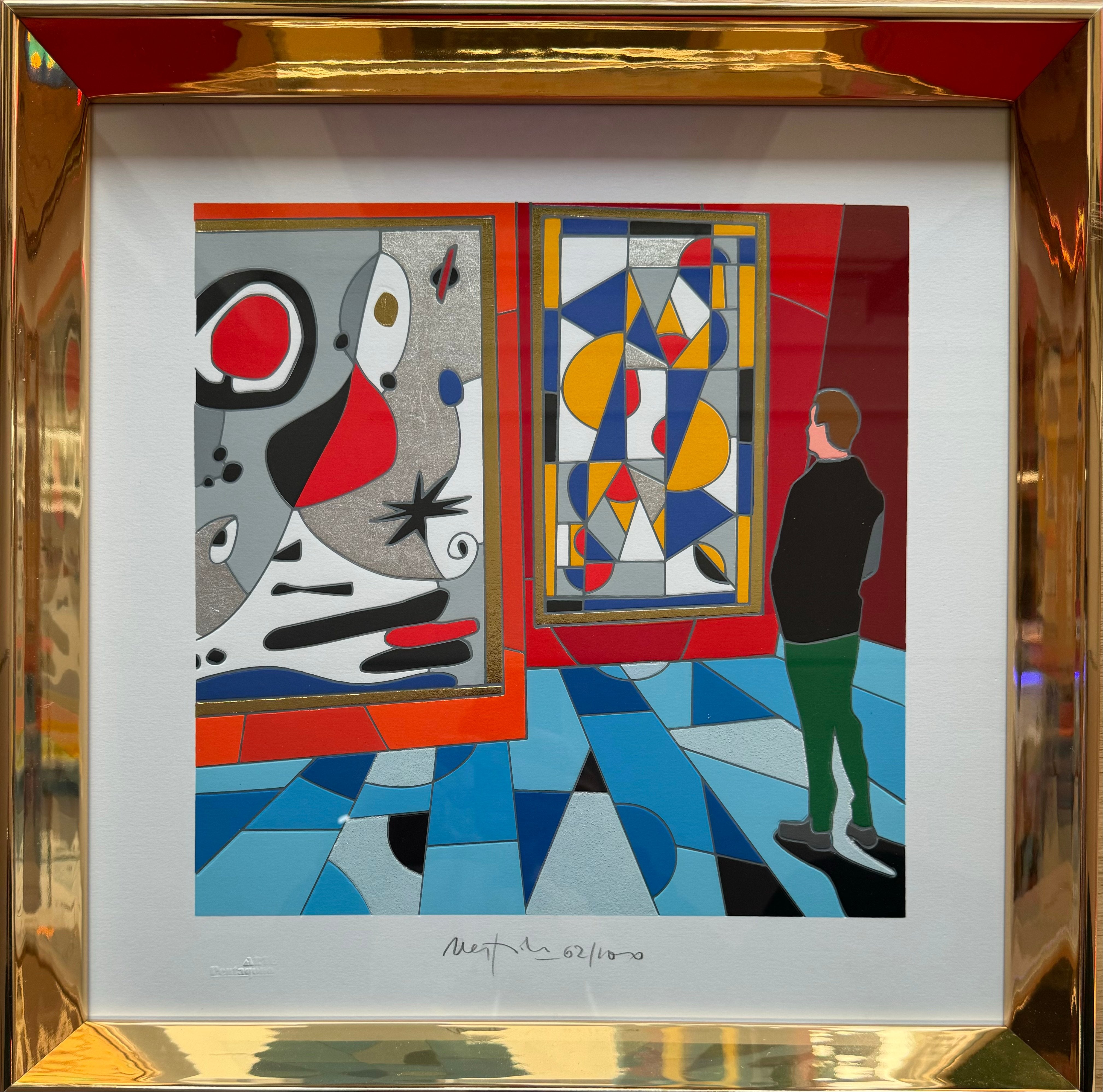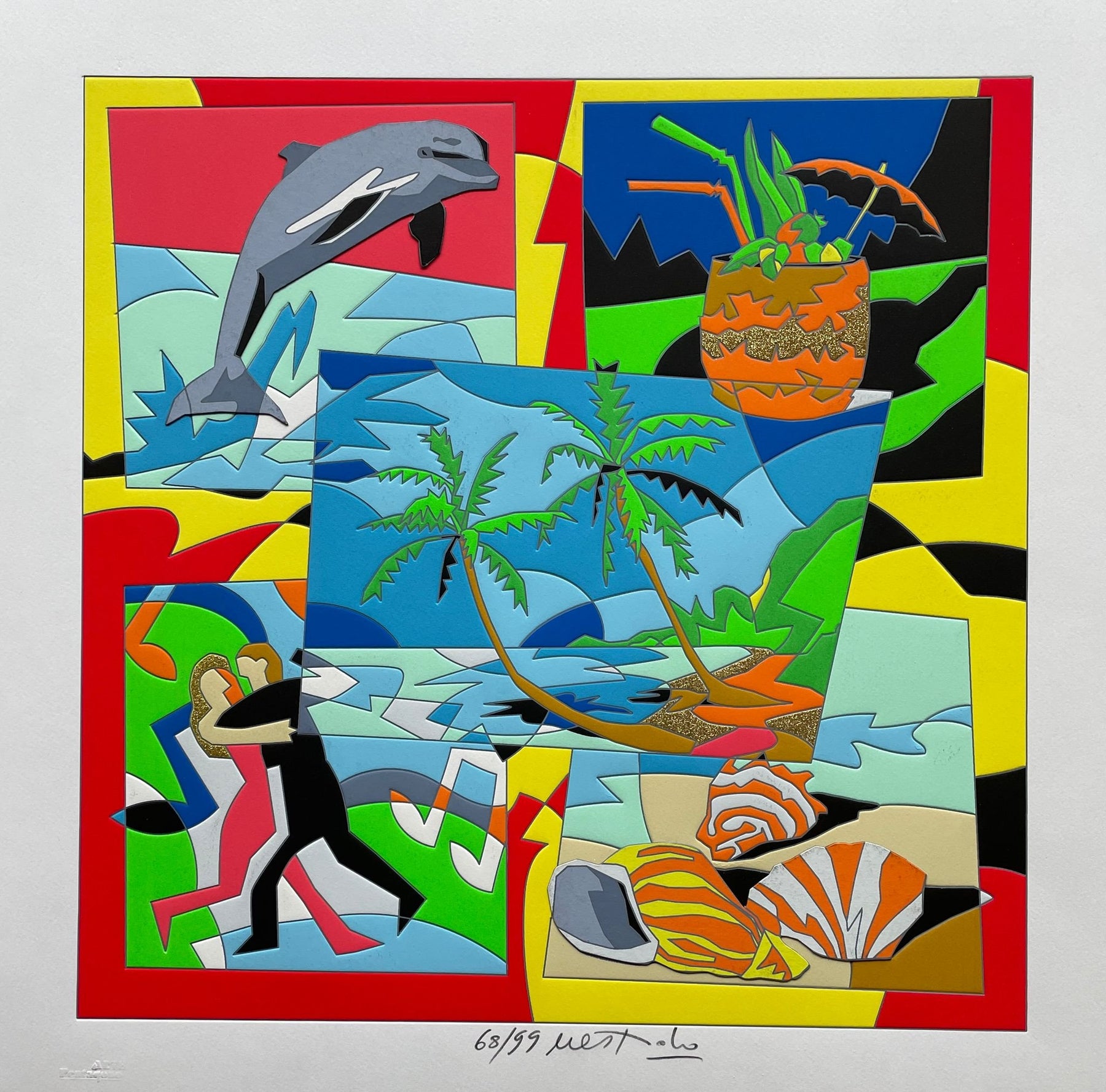 Serigrafia realizzata interamente a mano a 46 passaggi di colore con interventi in carborundum, collage floccaggi, stoffe e passaggio calcografico a secco.
