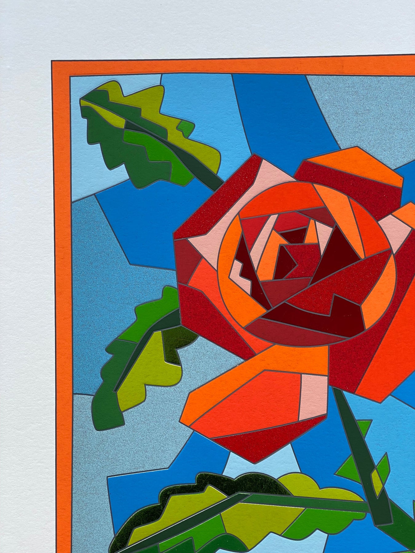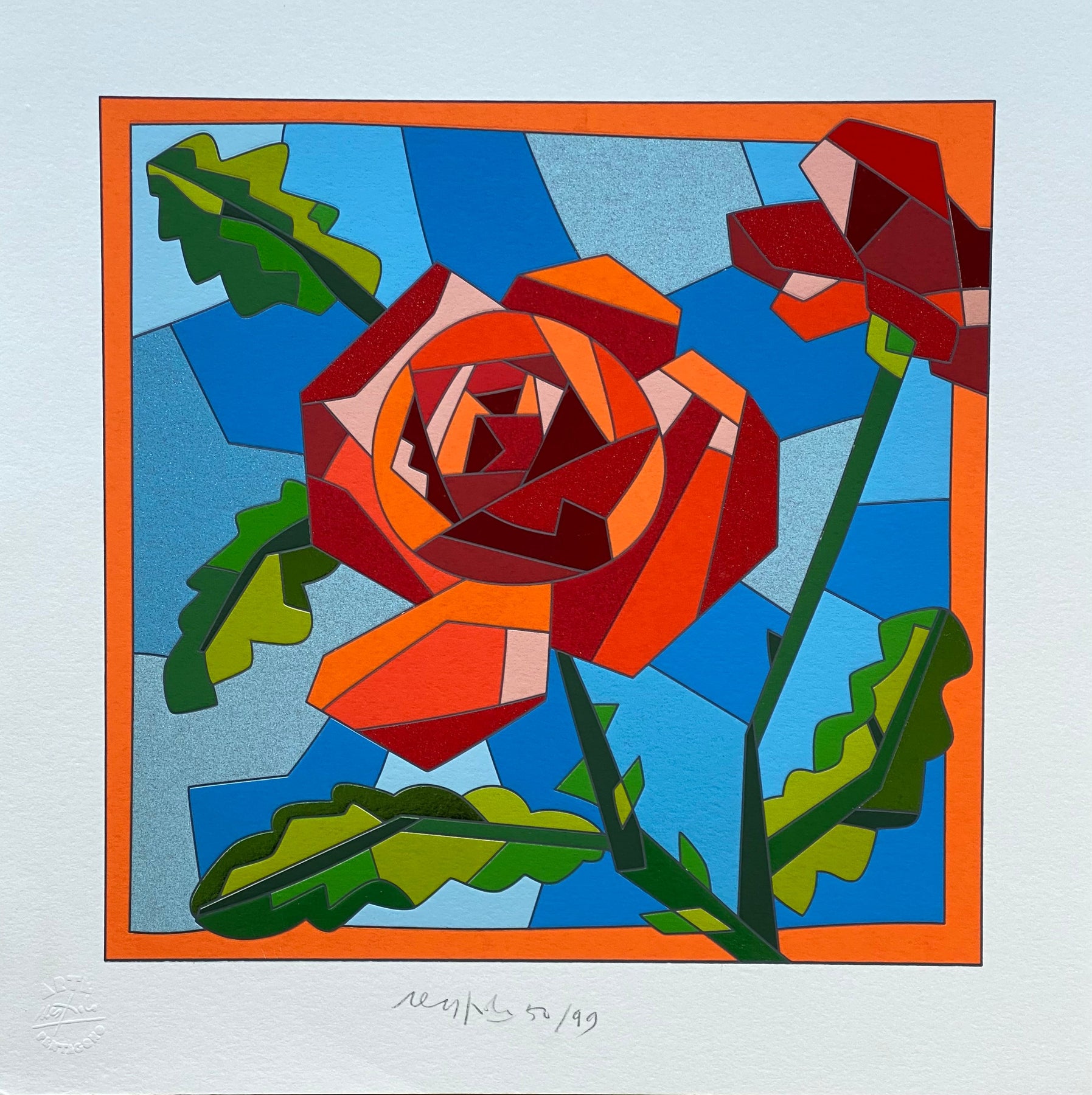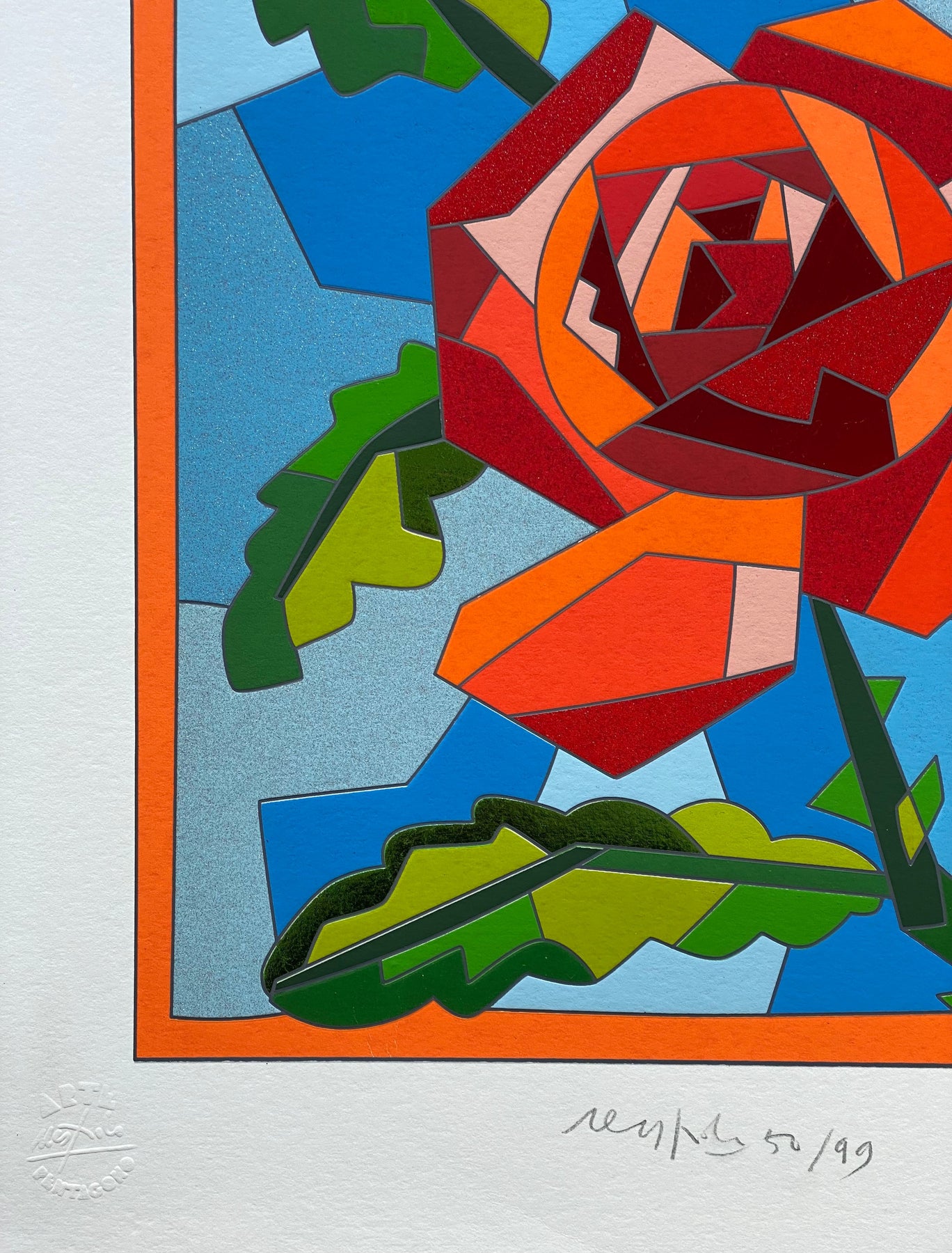 Serigrafia realizzata interamente a mano a 46 passaggi di colore con interventi in carborundum, floccaggi, foglia oro e passaggio calcografico a secco.