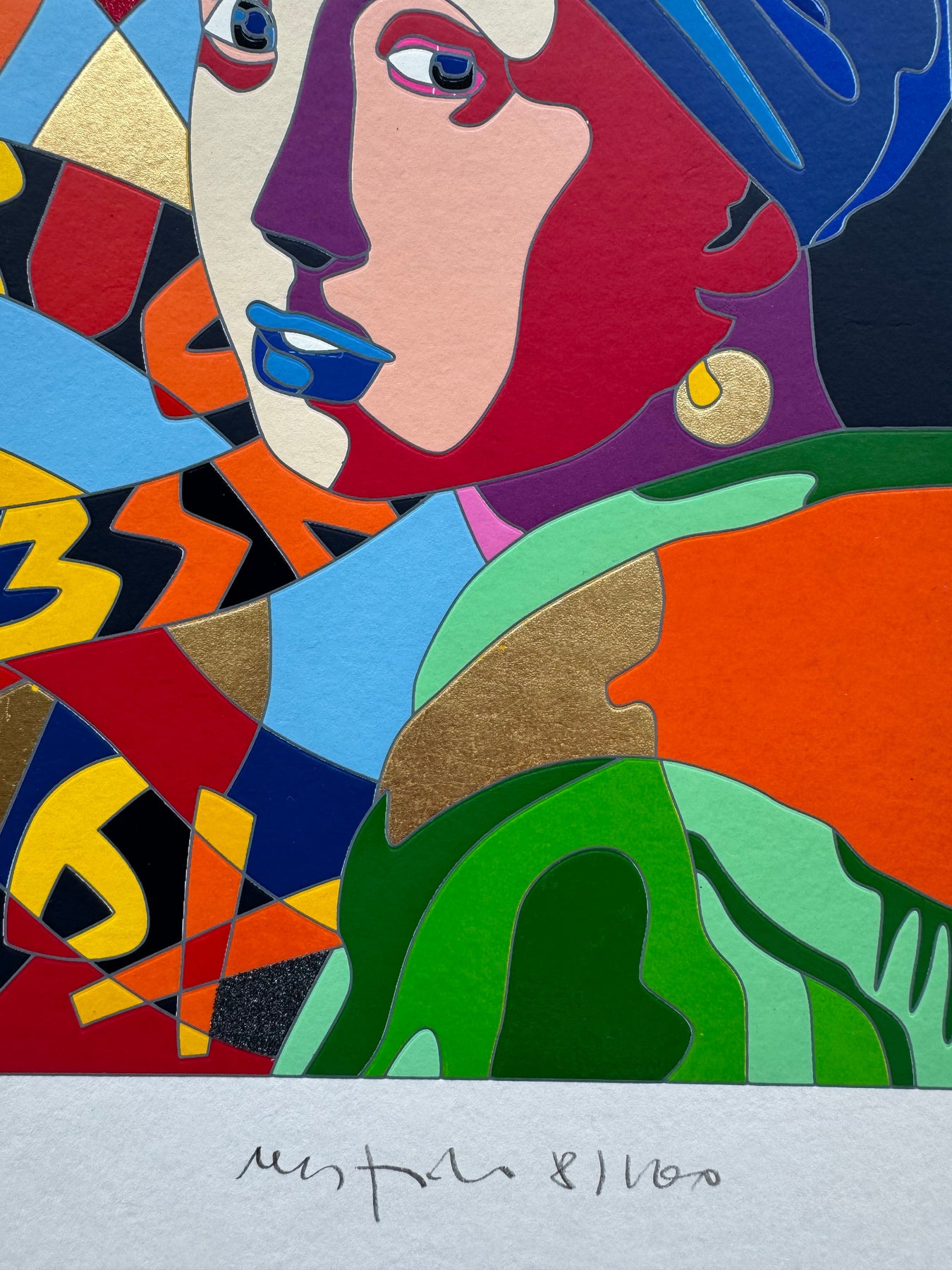 Serigrafia realizzata interamente a mano con interventi in carborundum, collage, floccaggi, foglia oro e passaggio calcografico a secco.