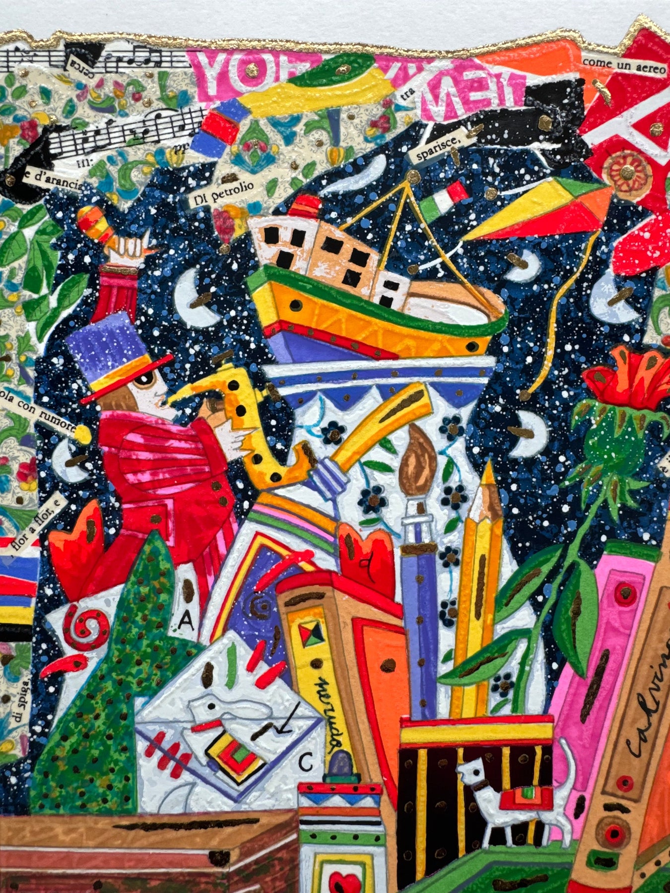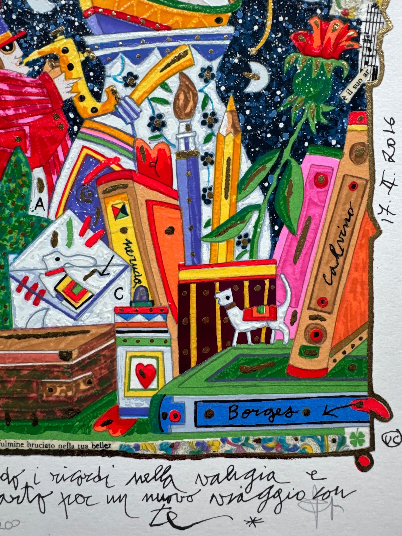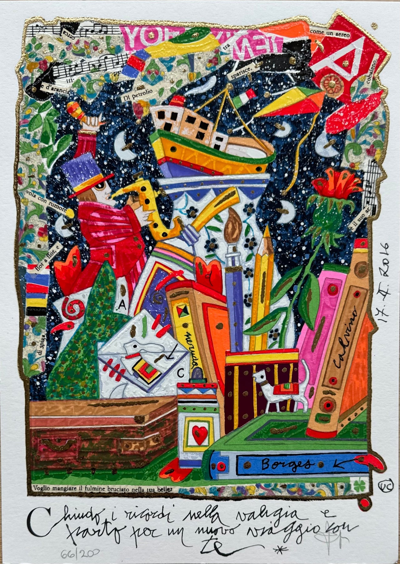 Serigrafia polimaterica del Maestro Francesco Musante con foglia oro e glitter. La tecnica utilizzata restituisce alla vista e al tatto lo spessore del colore e delle pennellate.