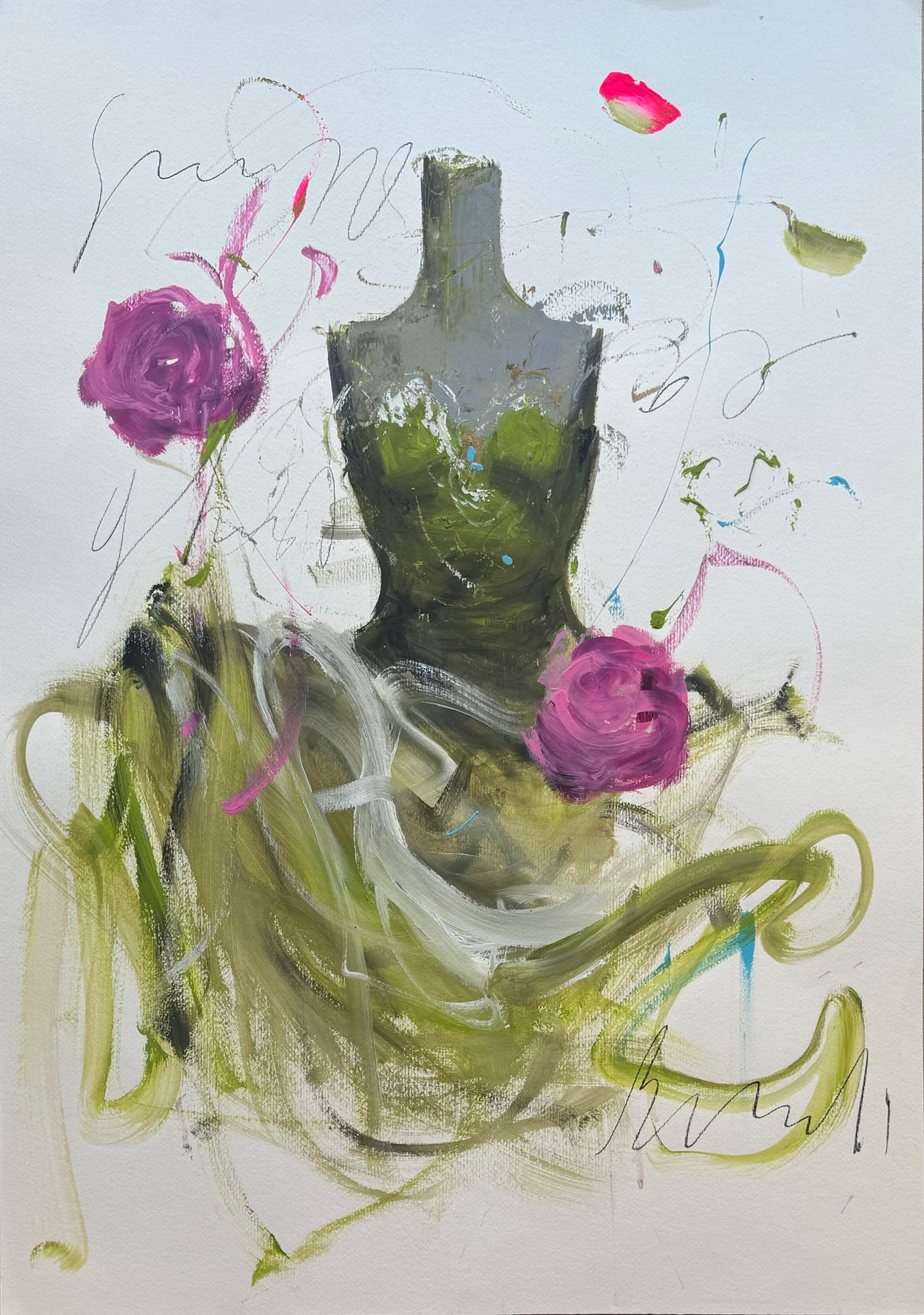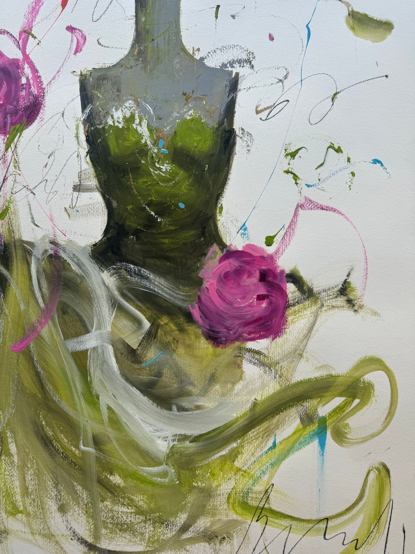 Nel dipinto, un manichino avvolto da toni verdi e vivaci tocchi di rosa sembra danzare tra linee fluide e squarci di luce. Gli elementi vibrano di vita propria, creando un'atmosfera di serenità e dinamismo. Le pennellate audaci e i dettagli delicati lavorano insieme per ispirare riflessioni sulla bellezza e l'effimero.