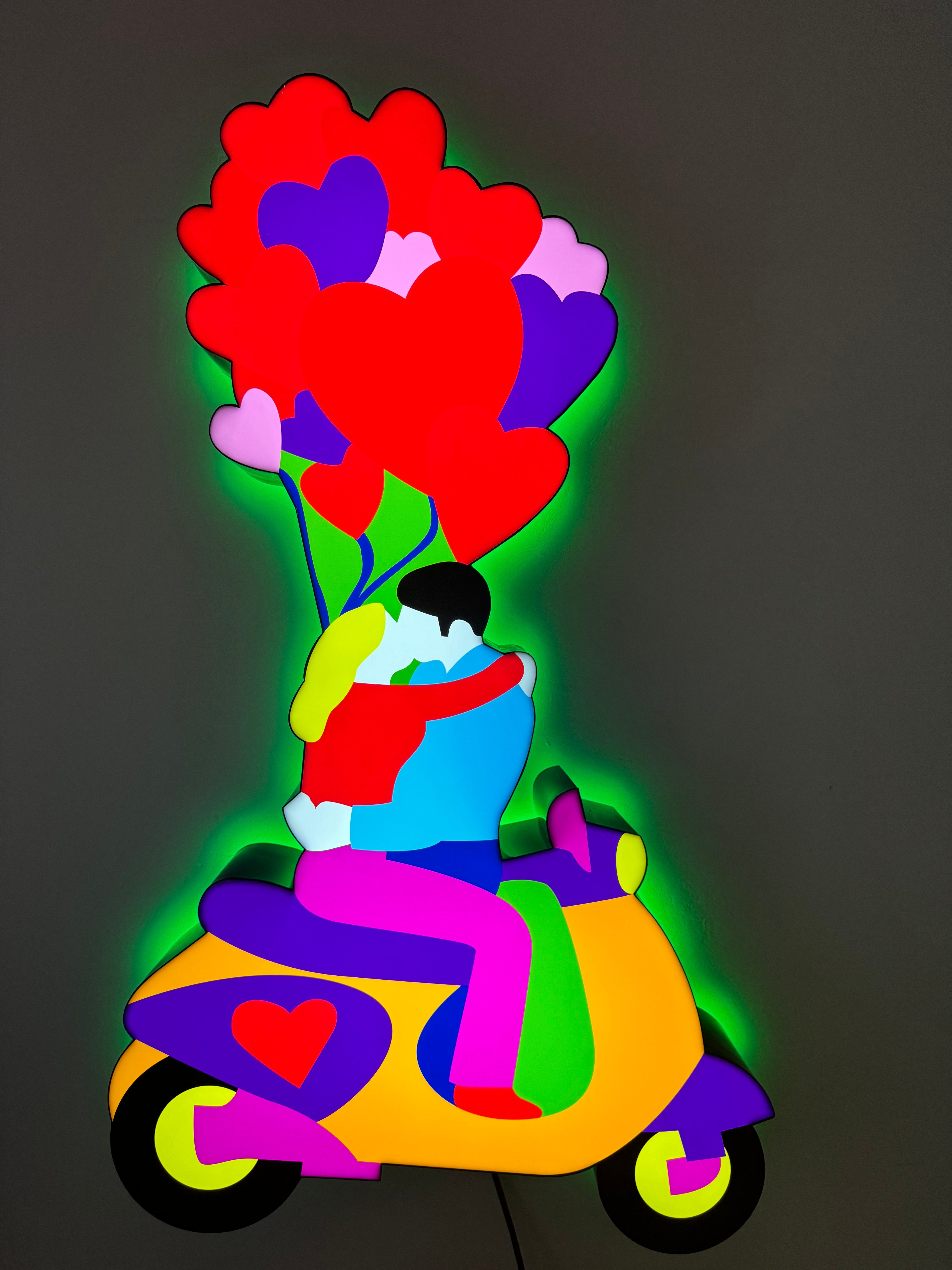 Splendida scultura luminosa a parete del Maestro Marco Lodola, dove gioia e divertimento, magia e fantasia, sono gli ingredienti che caratterizzano il suo percorso creativo. In questa scultura luminosa lavorata in perspex, l'anima pop di Lodola si manifesta appunto per stare in mezzo a noi, parlando con semplicità il nostro linguaggio.
