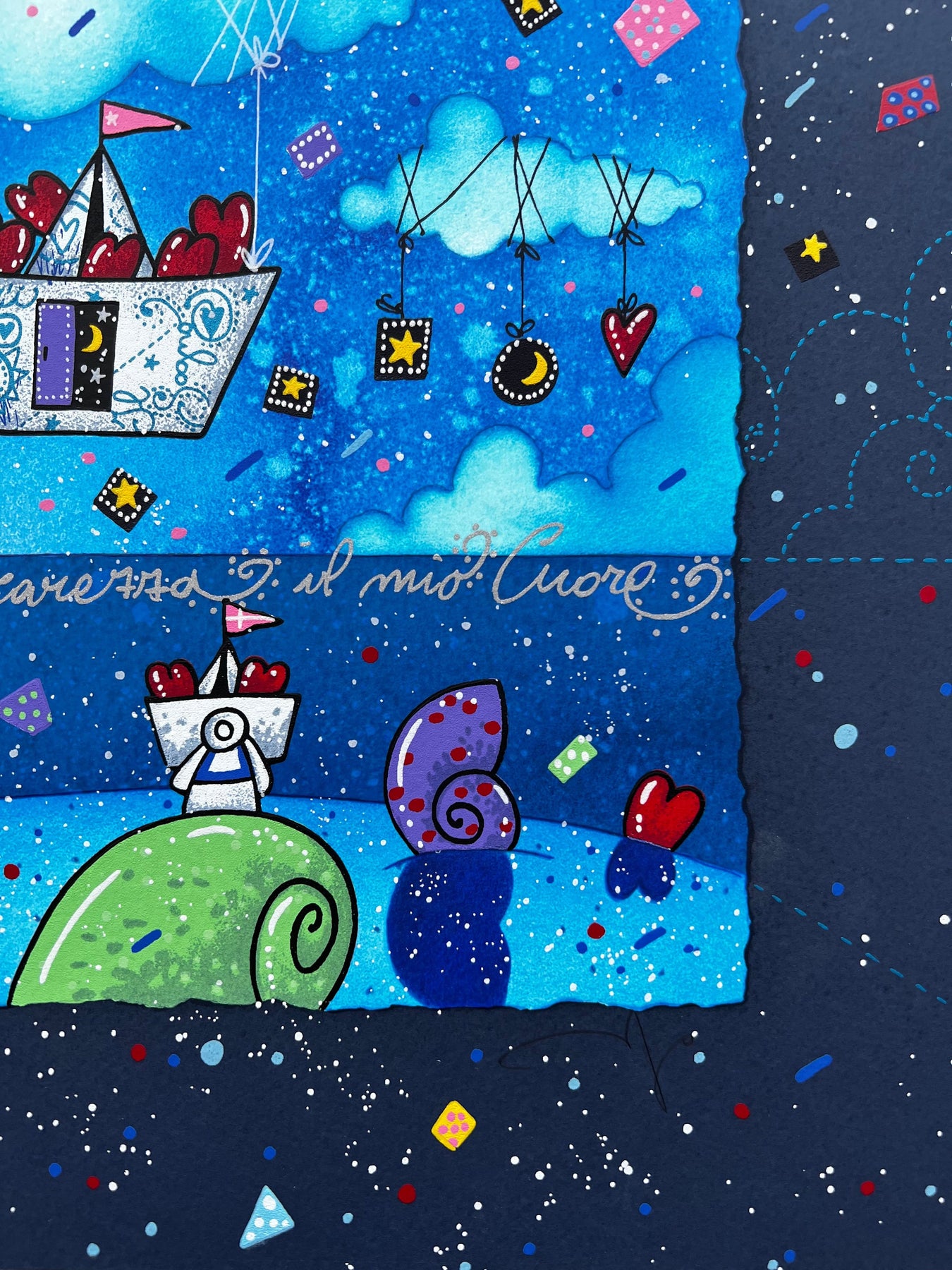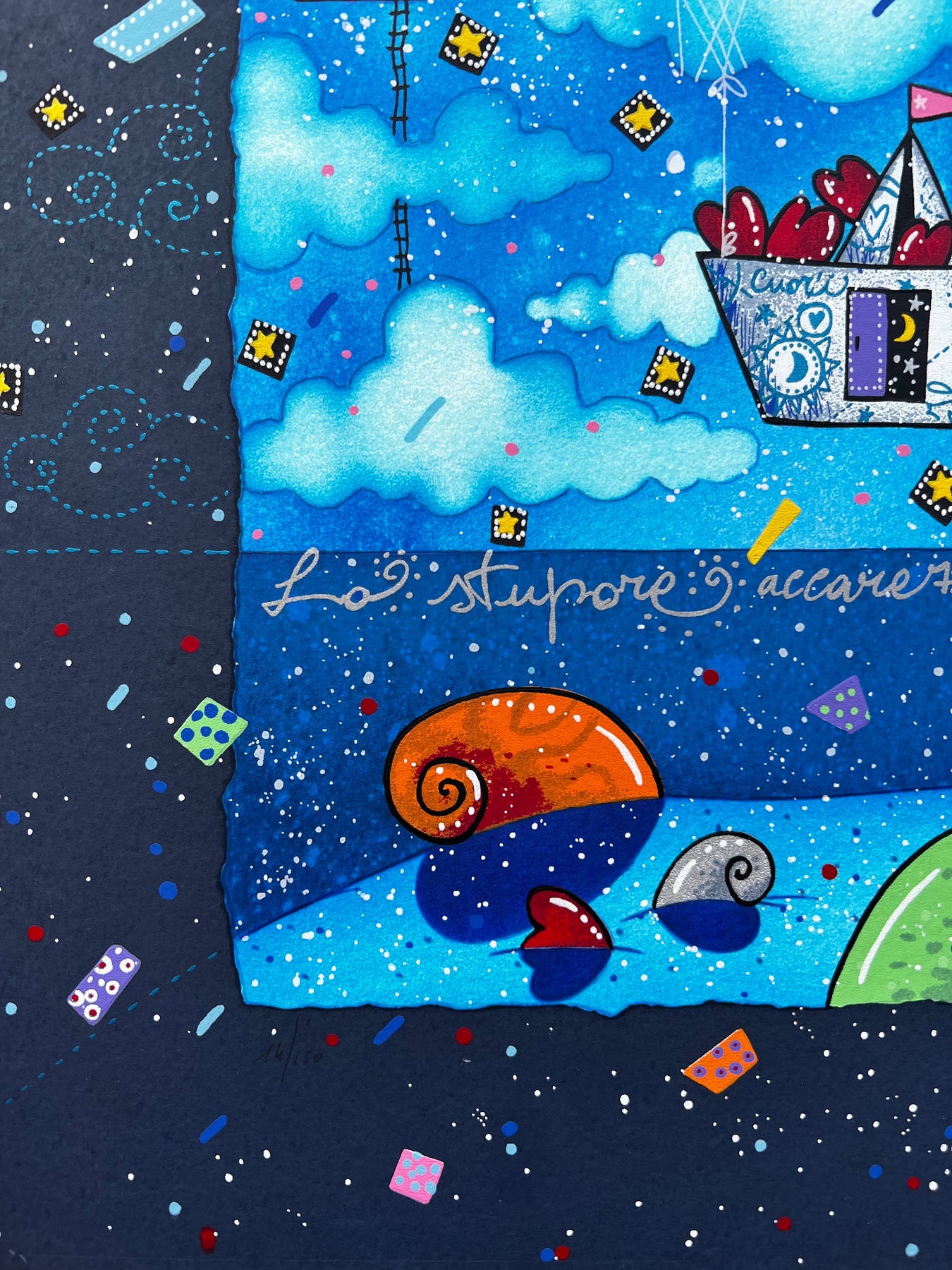 Serigrafia polimaterica di dimensioni 40x40cm, facente parte della nuova cartella "Segui la rotta del cuore".
