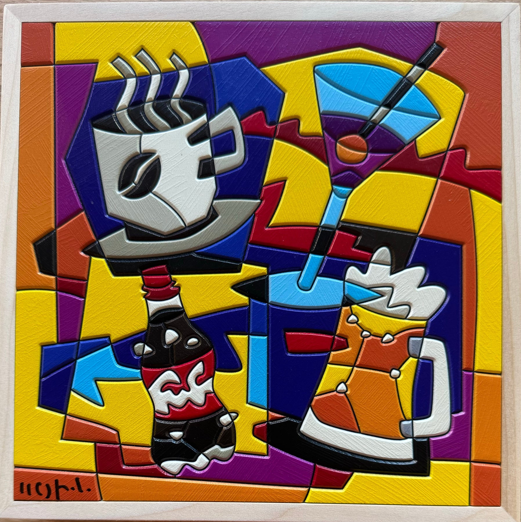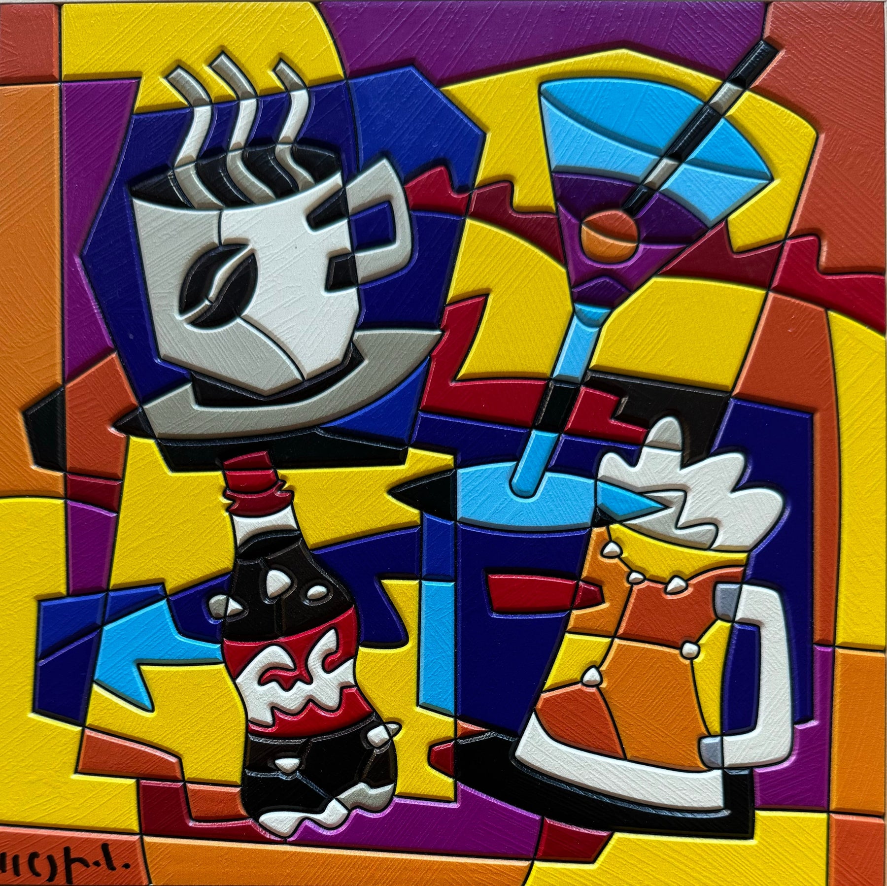 Opera unica di grande qualità del maestro Ugo Nespolo, acrilici su HDF, con autentica firmata di pugno dall’artista.