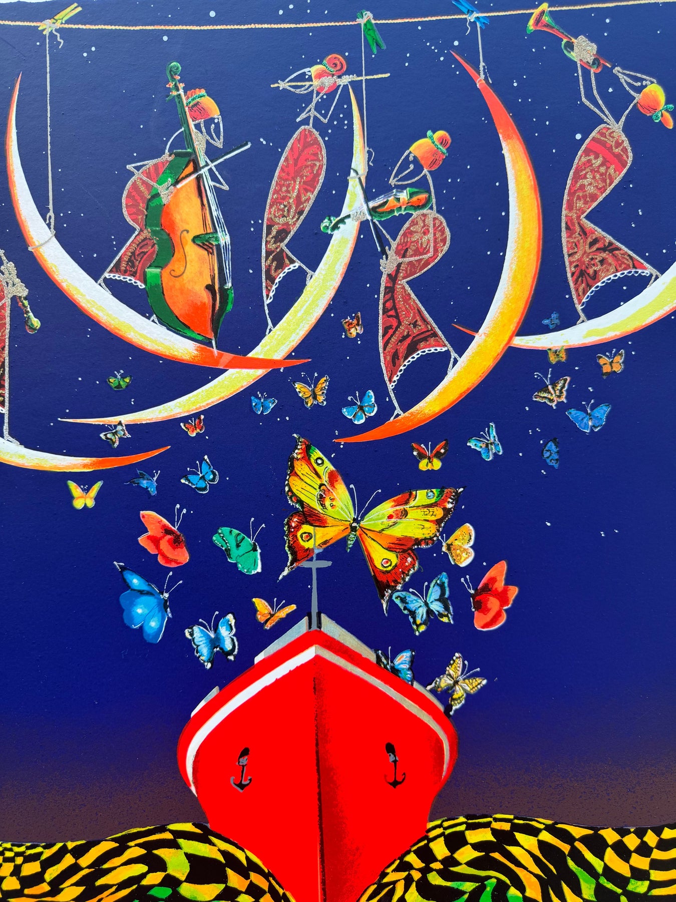 I quadri di Meloniski da Villacidro evocano atmosfere sognanti, in cui la realtà si trasfigura in uno scenario da fiaba surrealista: i personaggi fluttuano nel cielo suonando i loro strumenti, i pesci solcano le città addormentate, gli aquiloni si librano fra le stelle.