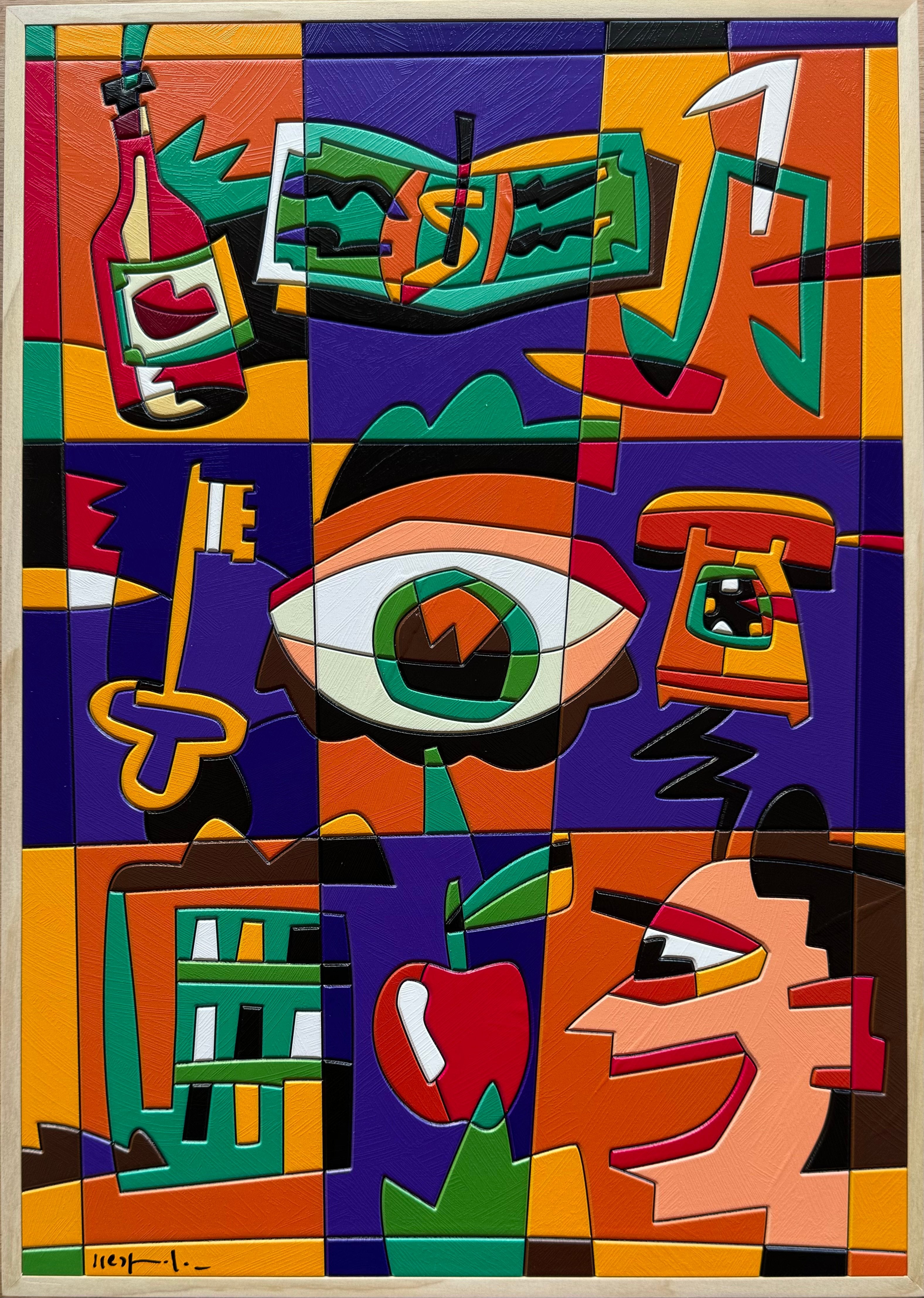 Opera unica di grande qualità del maestro Ugo Nespolo, acrilici su HDF, con autentica firmata di pugno dall’artista.