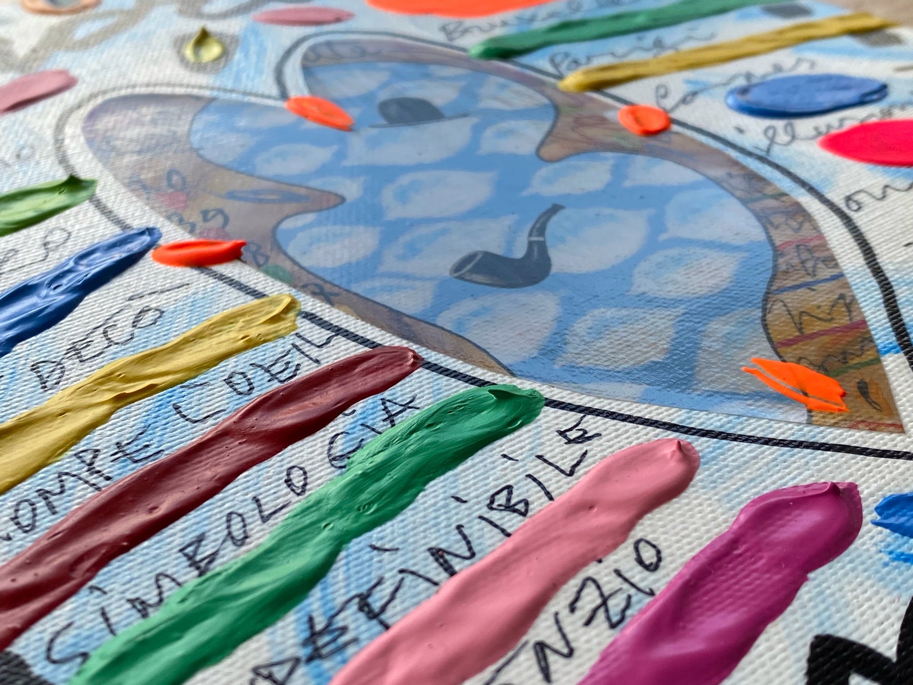 Opera unica del maestro Bruno Donzelli, la sua è una pittura narrativa, vivacissima anzi scoppiettante, che si nutre di spietate rivisitazioni, più che di citazioni.