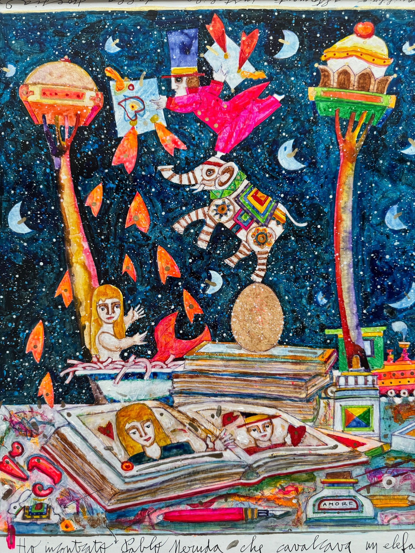 Le sue prime sperimentazioni artistiche risalgono al 1967: si tratta perlopiù di ricerche astratte su grandi campiture di colore. L’anno successivo comincia a esporre le sue opere in mostre collettive, concorsi di pittura e premi.I lavori degli anni 69-70 risentono dell’influenza della Pop Art e dei Combine Paintings di Rauschenberg: chiari i riferimenti all’America attraverso l’uso di scritte e l’inserimento di oggetti e legni.A partire dal 1971 Musante decide di fare l’artista a tempo pieno.Nel 1975 si assiste a un cambio di rotta: Musante si dedica alla pittura figurativa, inizialmente creando una serie di figure femminili ispirate a Klimt e alla Secessione Viennese. Un tema che sviscererà lungo dieci anni utilizzando le più diverse tecniche – dall’acquerello, all’olio, al collage, all’incisione – e svariati supporti – tela, legno, ceramica, lastra, carta.A poco a poco comincia anche il lavoro con la grafica e gli acquerelli dove si intravedono i primi spunti narrativi e fantastici che contraddistinguono la sua opera dal 1985 fino ad oggi: compaiono i suoi “omini” che sembrano usciti da un libro di fiabe e inseriti in contesti pieni di oggetti, personaggi e parole. I dipinti di Musante escono finalmente dalle atmosfere drammatiche e si alleggeriscono.Nelle opere di Francesco Musante, i buffi protagonisti fluttuano in atmosfere surreali, in cui l’esperienza visiva è affiancata da frasi poetiche che talvolta evocano personaggi come Fabrizio de Andrè, Pablo Neruda e Hans Christian Andersen, celebri per le loro composizioni a carattere romantico. Le serigrafie e le opere uniche dell’artista Musante sono spesso arricchite da dettagli polimaterici, collage e glitter, e sono realizzate in numerosi formati. Tra questi ultimi il più diffuso è la serigrafia 8x10 cm, una preziosa carta che rappresenta un determinato soggetto ad esempio il Portafortuna. Le opere di Musante sono largamente richieste da un pubblico privato e istituzionale, pertanto le sue quotazioni medio-alte sono stabili.