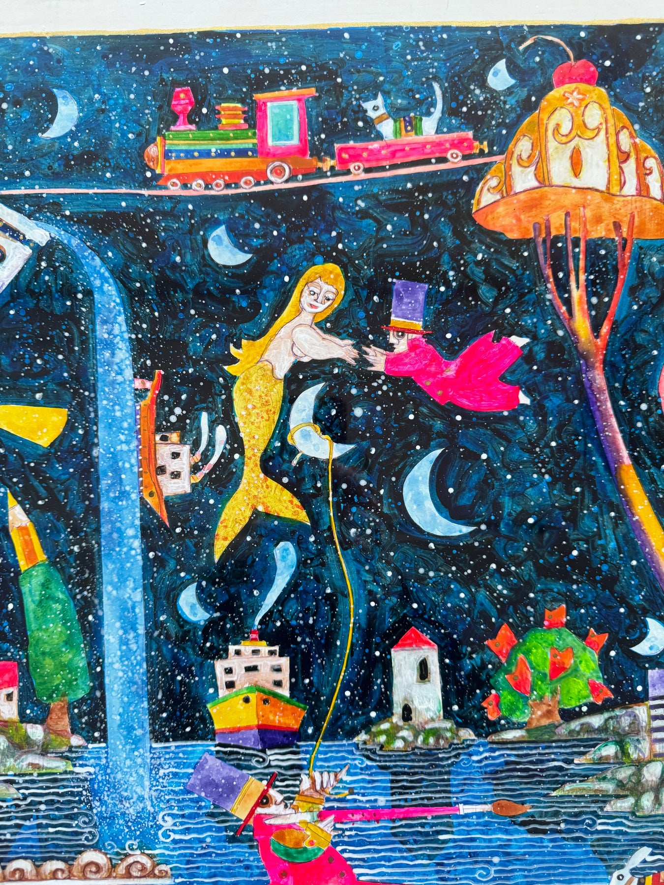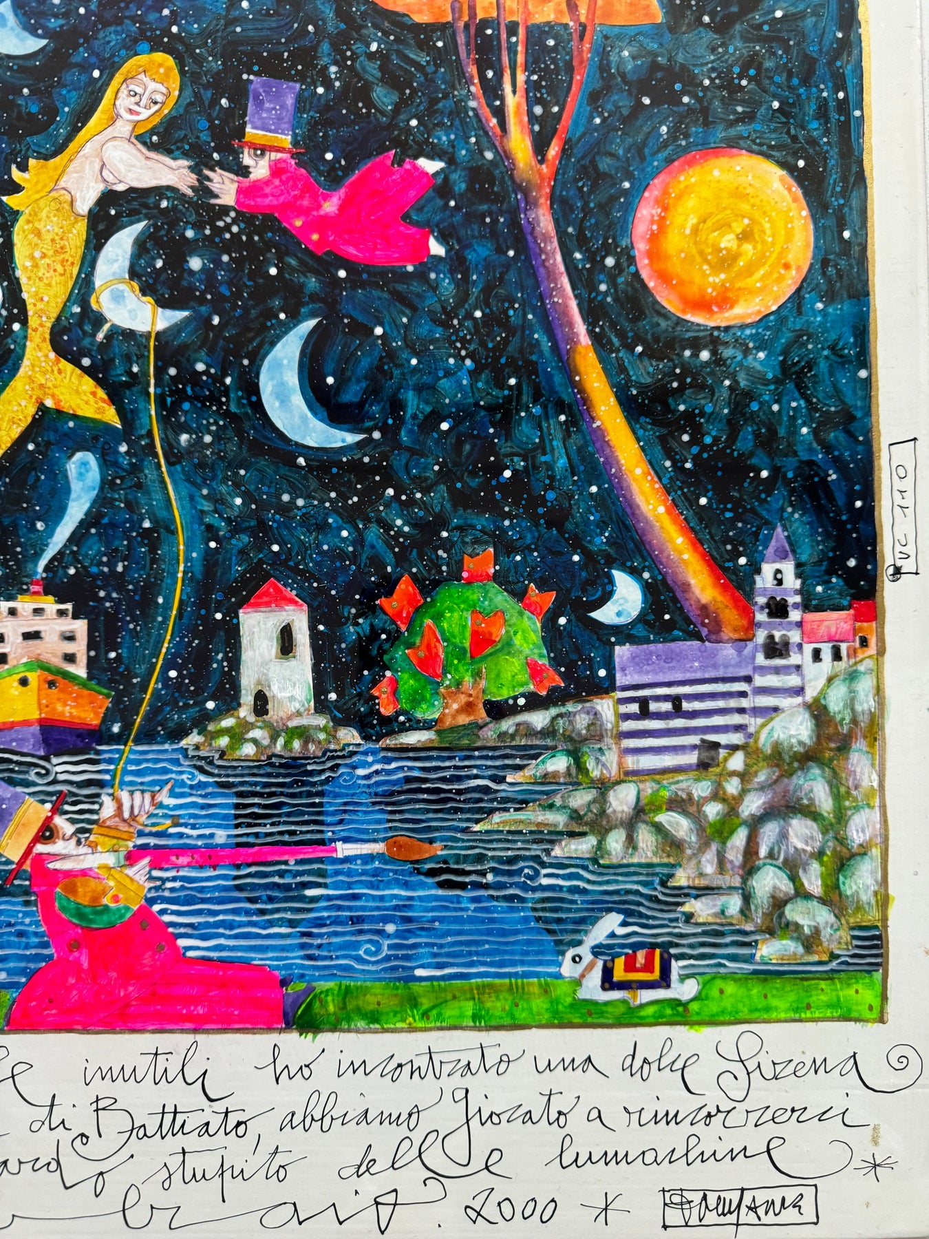 Le sue prime sperimentazioni artistiche risalgono al 1967: si tratta perlopiù di ricerche astratte su grandi campiture di colore. L’anno successivo comincia a esporre le sue opere in mostre collettive, concorsi di pittura e premi.I lavori degli anni 69-70 risentono dell’influenza della Pop Art e dei Combine Paintings di Rauschenberg: chiari i riferimenti all’America attraverso l’uso di scritte e l’inserimento di oggetti e legni.A partire dal 1971 Musante decide di fare l’artista a tempo pieno.Nel 1975 si assiste a un cambio di rotta: Musante si dedica alla pittura figurativa, inizialmente creando una serie di figure femminili ispirate a Klimt e alla Secessione Viennese. Un tema che sviscererà lungo dieci anni utilizzando le più diverse tecniche – dall’acquerello, all’olio, al collage, all’incisione – e svariati supporti – tela, legno, ceramica, lastra, carta.A poco a poco comincia anche il lavoro con la grafica e gli acquerelli dove si intravedono i primi spunti narrativi e fantastici che contraddistinguono la sua opera dal 1985 fino ad oggi: compaiono i suoi “omini” che sembrano usciti da un libro di fiabe e inseriti in contesti pieni di oggetti, personaggi e parole. I dipinti di Musante escono finalmente dalle atmosfere drammatiche e si alleggeriscono.Nelle opere di Francesco Musante, i buffi protagonisti fluttuano in atmosfere surreali, in cui l’esperienza visiva è affiancata da frasi poetiche che talvolta evocano personaggi come Fabrizio de Andrè, Pablo Neruda e Hans Christian Andersen, celebri per le loro composizioni a carattere romantico. Le serigrafie e le opere uniche dell’artista Musante sono spesso arricchite da dettagli polimaterici, collage e glitter, e sono realizzate in numerosi formati. Tra questi ultimi il più diffuso è la serigrafia 8x10 cm, una preziosa carta che rappresenta un determinato soggetto ad esempio il Portafortuna. Le opere di Musante sono largamente richieste da un pubblico privato e istituzionale, pertanto le sue quotazioni medio-alte sono stabili.