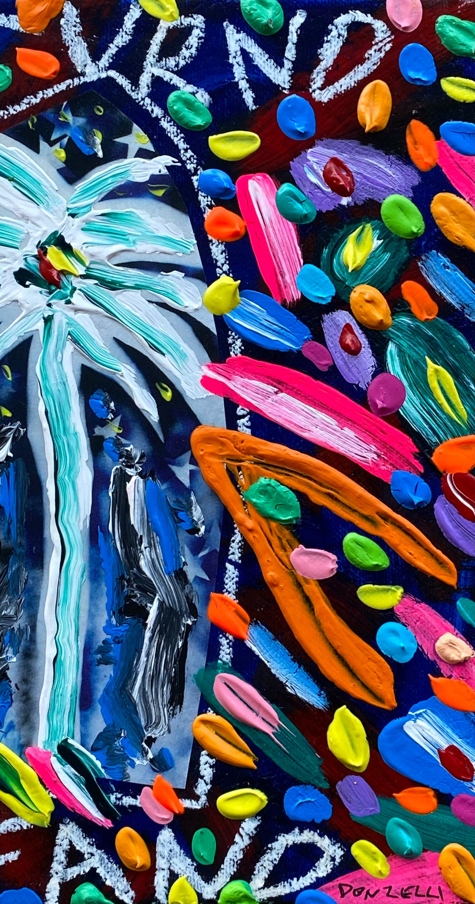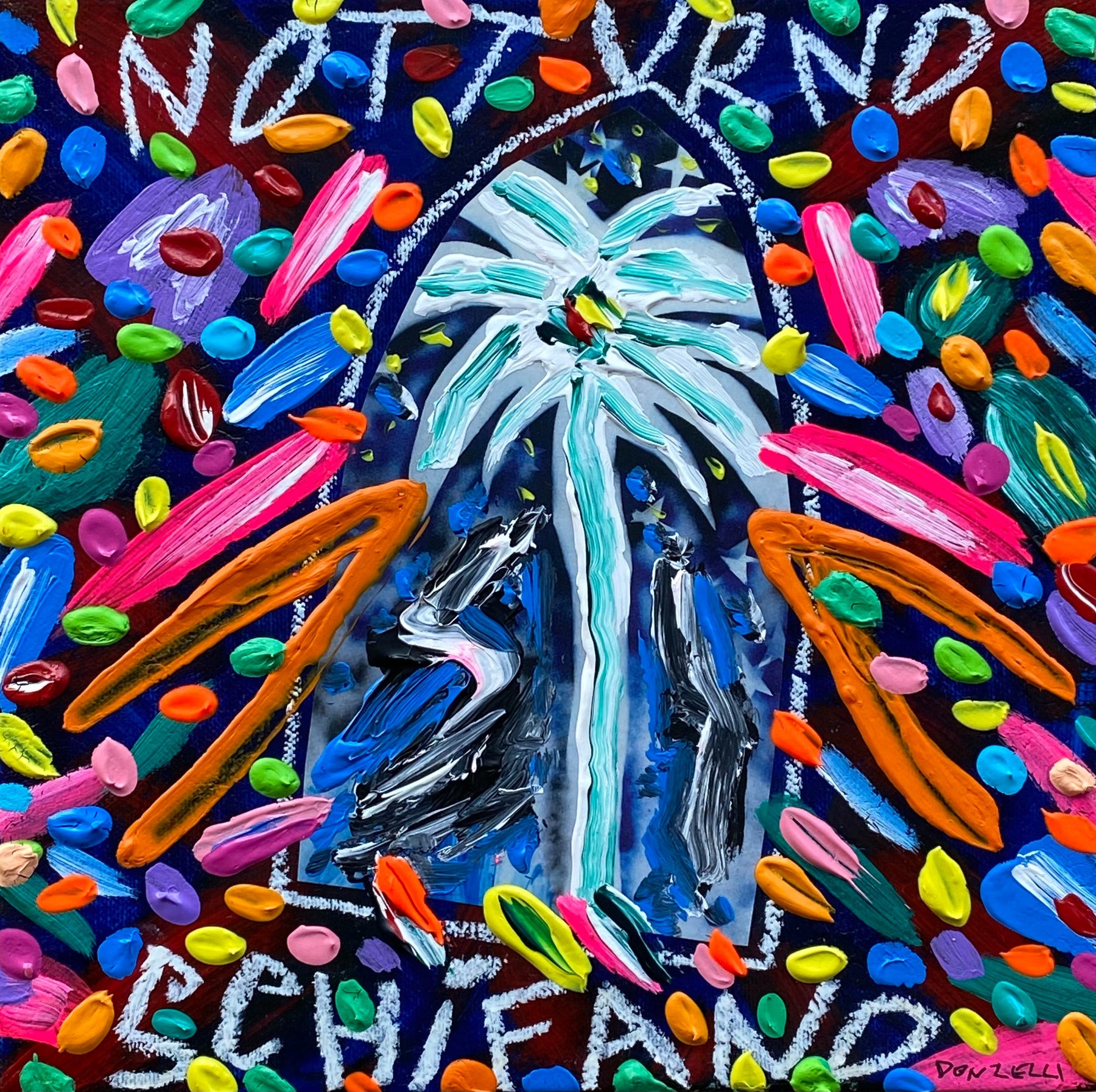 Opera unica del maestro Bruno Donzelli, la sua è una pittura narrativa, vivacissima anzi scoppiettante, che si nutre di spietate rivisitazioni, più che di citazioni.
