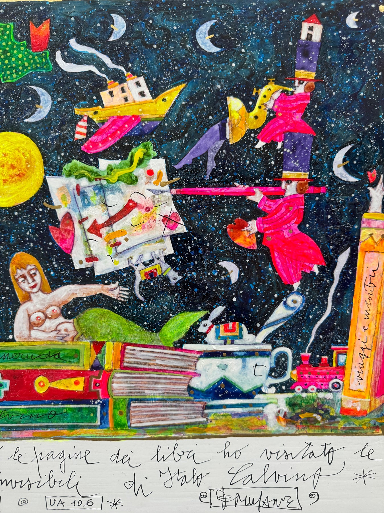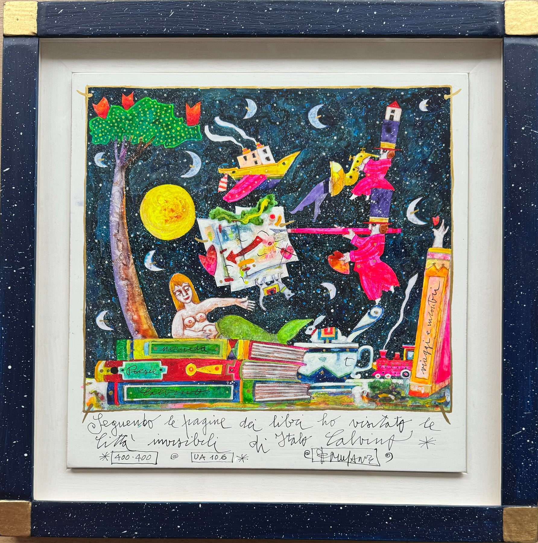 Le sue prime sperimentazioni artistiche risalgono al 1967: si tratta perlopiù di ricerche astratte su grandi campiture di colore. L’anno successivo comincia a esporre le sue opere in mostre collettive, concorsi di pittura e premi.I lavori degli anni 69-70 risentono dell’influenza della Pop Art e dei Combine Paintings di Rauschenberg: chiari i riferimenti all’America attraverso l’uso di scritte e l’inserimento di oggetti e legni.A partire dal 1971 Musante decide di fare l’artista a tempo pieno.Nel 1975 si assiste a un cambio di rotta: Musante si dedica alla pittura figurativa, inizialmente creando una serie di figure femminili ispirate a Klimt e alla Secessione Viennese. Un tema che sviscererà lungo dieci anni utilizzando le più diverse tecniche – dall’acquerello, all’olio, al collage, all’incisione – e svariati supporti – tela, legno, ceramica, lastra, carta.A poco a poco comincia anche il lavoro con la grafica e gli acquerelli dove si intravedono i primi spunti narrativi e fantastici che contraddistinguono la sua opera dal 1985 fino ad oggi: compaiono i suoi “omini” che sembrano usciti da un libro di fiabe e inseriti in contesti pieni di oggetti, personaggi e parole. I dipinti di Musante escono finalmente dalle atmosfere drammatiche e si alleggeriscono.Nelle opere di Francesco Musante, i buffi protagonisti fluttuano in atmosfere surreali, in cui l’esperienza visiva è affiancata da frasi poetiche che talvolta evocano personaggi come Fabrizio de Andrè, Pablo Neruda e Hans Christian Andersen, celebri per le loro composizioni a carattere romantico. Le serigrafie e le opere uniche dell’artista Musante sono spesso arricchite da dettagli polimaterici, collage e glitter, e sono realizzate in numerosi formati. Tra questi ultimi il più diffuso è la serigrafia 8x10 cm, una preziosa carta che rappresenta un determinato soggetto ad esempio il Portafortuna. Le opere di Musante sono largamente richieste da un pubblico privato e istituzionale, pertanto le sue quotazioni medio-alte sono stabili.